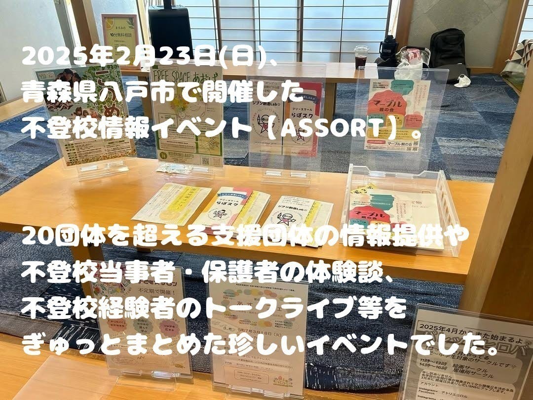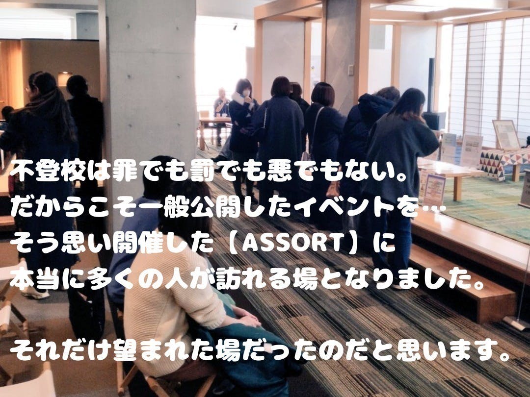 その間多くのご縁に恵まれ、多くの助けを得て、今年の2月には市内および近隣の不登校に関する情報(支援団体や体験談などの公開・不登校経験者のトークライブ)を集約・公開するイベント【ASSORT ~不登校の情報・声・居場所集めました~】を開くことができました。
