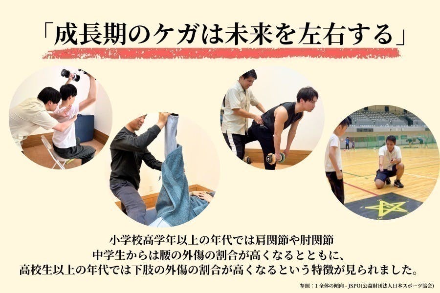 • ・成長期に多いケガ(膝成長痛、分離症、肩・肘の痛み)を防ぐ