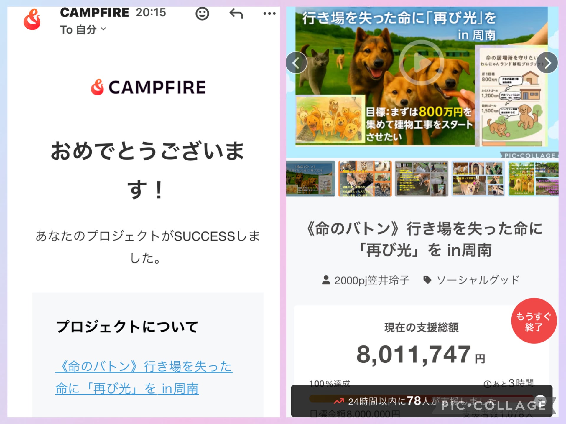 本日13時、大切な仲間「アカ君」が虹の橋を渡りました。すぐに皆さまへ訃報をお伝えしましたが、胸がいっぱいで言葉が追いつきません。そんな日に、クラウドファンディングが目標を超え SUCCESS したことをご報告できるのは、何とも不思議な巡り合わせです。皆さまからのご支援は、まるで「アカ君からのバトン」のように感じています。現在、クラファンでは8,011,747円、加えて通帳に900万円が集まり、総額1,700万円に達しました。広告費を差し引いた実際の資金は約1,535万円となります。必要な総額2,250万円にはまだ届いていませんが、大きな一歩を踏み出すことができました。アカ君の命を忘れずに、残された子たちの未来を守るために、このご支援を必ず形にしてまいります。心からの感謝を込めて。プロジェクト作成者 笠井玲子