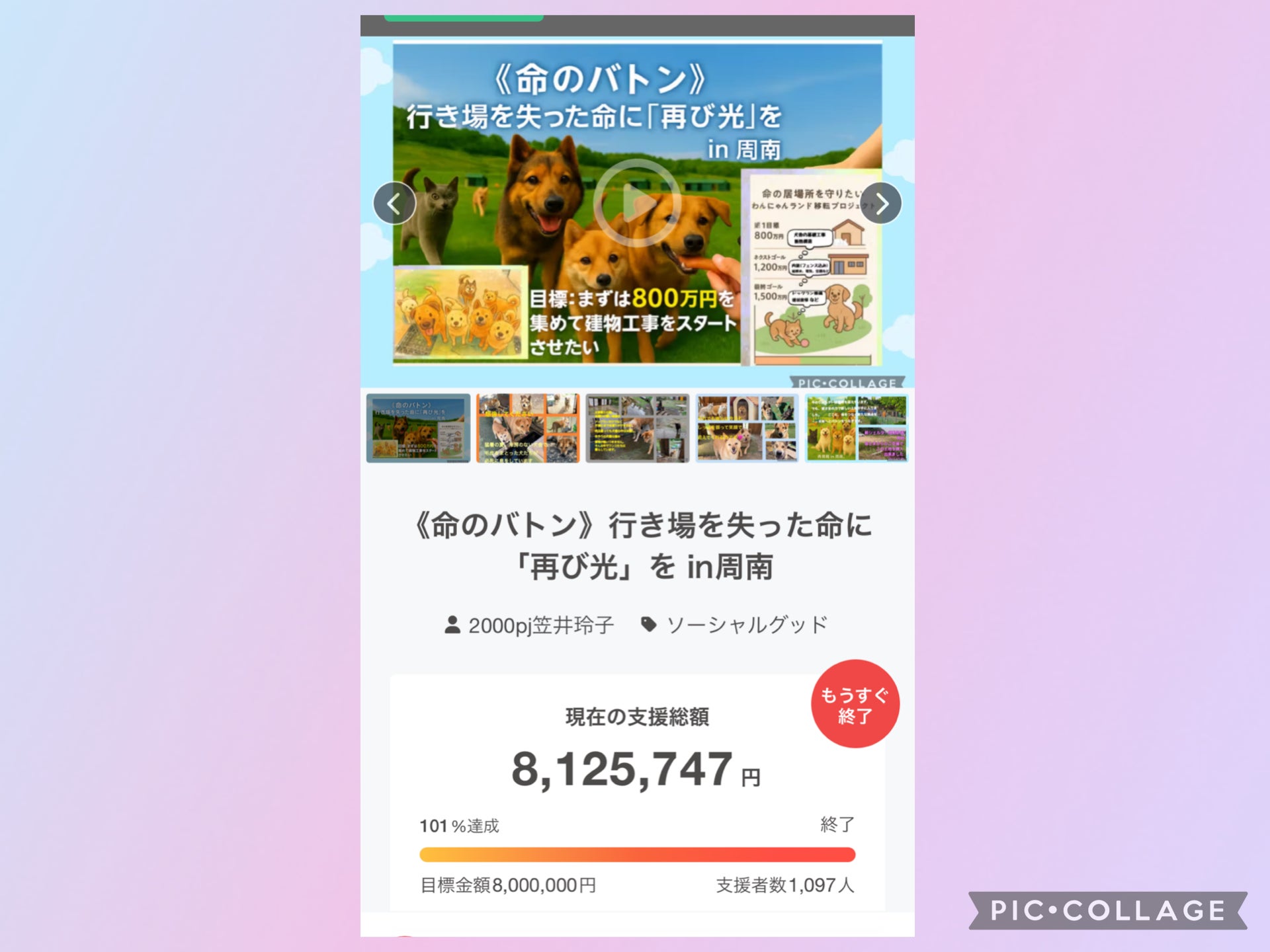 皆さまの温かいご支援と応援に支えられ、クラウドファンディングは 8,125,747円・1,097人 ものご支援をいただき、無事に終了いたしました。心より御礼申し上げます。クラファンとは別に通帳への直接ご支援も合わせ、総額は1,700万円を超える大きな力となりました。必要な総額2,250万円にはまだ届きませんが、いただいたご支援を最大限に活かし、犬や猫たちが安心して暮らせる新しいシェルターを実現するため、これから本格的に動き出します。このクラウドファンディングはゴールではなく、新しいスタートです。アカ君をはじめ、これまでの仲間たちの命を胸に、残された子たちの未来へとつなげてまいります。皆さま、本当にありがとうございました。今後の歩みも、どうぞ温かく見守っていただけましたら幸いですプロジェクト作成者 笠井玲子