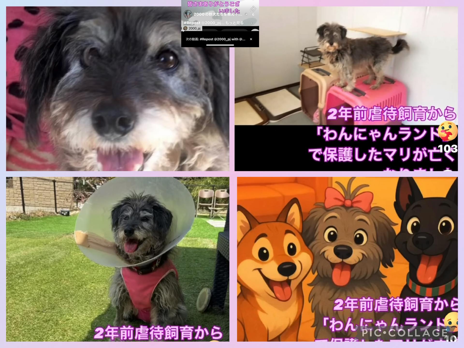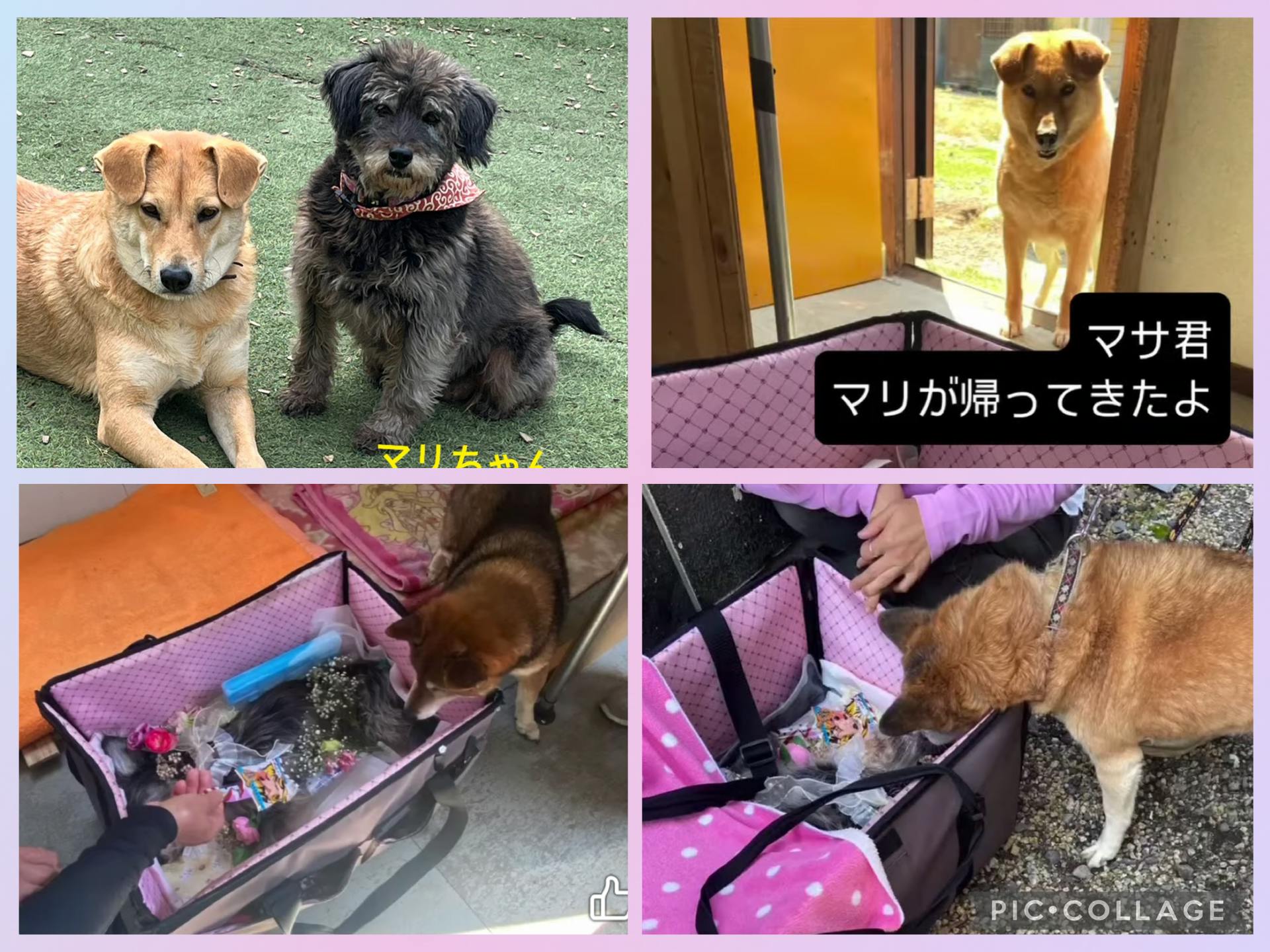 元気にドッグランを走り回っていたマリが2025年夏ごろから食欲がなくなり、3月には元気もなくなり、はじめの獣医さんでもらった薬を飲ませていたのですが、獣医さんをかえたところ尿道に腫瘍がみつかり、膀胱がボロボロになってしまっていました。数回の人工尿管を作る手術の後、ボランティアさんの家で献身的に介護をしてもらったところ、奇跡的に膀胱が再生されたため、山口大学獣医科で大手術を受けました。その時に肺がんが見つかってしまいました。その後は残りの命を楽しんでもらおうと、預かりボランティアさんのお宅や仕事場でお姫様のように暮らし、またリン母さんの近くで過ごしたりさせてくださり、5月に12年の命を閉じました。