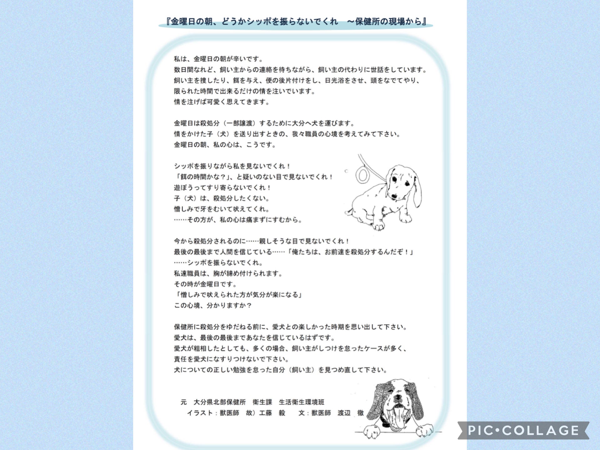 『金曜日の朝、どうかシッポを振らないでくれ ~保健所の現場から』私は、金曜日の朝が辛いです。数日間なれど、飼い主からの連絡を待ちながら、飼い主の代わりに世話をしています。飼い主を捜したり、餌を与え、便の後片付けをし、日光浴をさせ、頭をなでてやり、限られた時間で出来るだけの情を注いでいます。情を注げば可愛く思えてきます。金曜日は殺処分(一部譲渡)するために大分へ犬を運びます。情をかけた子(犬)を送り出すときの、我々職員の心境を考えてみて下さい。金曜日の朝、私の心は、こうです。 シッポを振りながら私を見ないでくれ!「餌の時間かな?」 、と疑いのない目で見ないでくれ!遊ぼうってすり寄らないでくれ!子(犬)は、殺処分したくない。憎しみで牙をむいて吠えてくれ。……その方が、私の心は痛まずにすむから。今から殺処分されるのに……親しそうな目で見ないでくれ!最後の最後まで人間を信じている……「俺たちは、お前達を殺処分するんだぞ!」……シッポを振らないでくれ。私達職員は、胸が締め付けられます。その時が金曜日です。「憎しみで吠えられた方が気分が楽になる」この心境、分かりますか?保健所に殺処分をゆだねる前に、愛犬との楽しかった時期を思い出して下さい。愛犬は、最後の最後まであなたを信じているはずです。愛犬が粗相したとしても、多くの場合、飼い主がしつけを怠ったケースが多く、責任を愛犬になすりつけないで下さい。犬についての正しい勉強を怠った自分(飼い主)を見つめ直して下さい。手記の作者で大分県の殺処分を減らすため尽力されている獣医師 渡邊徹さまより温かいメッセージをいただきました。笠井さん、臼田さんへ私の手記をきっかけに知り合い、その誠実で真摯な姿勢、そして動物たちへの深い愛情に何度も胸を打たれました。山口の「わんにゃんランド」を創設された平山ガンマンさんの揺るぎない志をしっかりと受け継ぎ、東京を拠点に地元の団体を支えながら日々懸命に活動されている御二人の姿は、私にとって尊敬そのものです。平山さんが残した温かな想いとその足跡を、今もなお繋ぎ、守り続けていることの重みと責任を感じます。それは決して容易いことではないはずですが、御二人の熱意と献身は多くの命にとってかけがえのない光となっていると信じています。どうか、その大切な想いを胸に、ご自身のペースを大切にしながら歩みを続けてください。遠く大分からですが、変わらぬ敬意と応援の気持ちを込めて、心よりエールを送ります。渡辺3/8ガンマンさんのお墓参りへいらしてくださいました渡邊さま、臼田、笠井の3人でインスタライブをあげました笠井よりガンマンさんが亡くなった際、冒頭の手記を書かれた渡邊獣医師より連絡をいただきました。ガンマンさんが渡邊獣医師の手記を取り上げた事で生前のガンマンさんとメッセージでのやり取りがあったそうです。15年ほど前よりガンマンさん、臼田さんと共に「犬猫の殺処分を廃止」を求める署名を集めていた私でしたので、この手記を読んだ時に胸が締め付けられる思いでした。現場の方たちも辛い思いをしていらっしゃることへ初めて思いを馳せたものでした。渡邊獣医師より連絡をいただき、今年3月8日にガンマンさんのお墓詣りにご一緒させていただきました。その時、インスタライブで渡辺獣医師ご本人が手記を読んでくださいました。私たちは殺処分に心を傷め、集めた署名約12万人分を他団体と一緒に環境省へ提案書と一緒に持参しました。そして野犬が多く、捕獲されると1週間の内に声がかからないと殺処分器のあるセンターへ移動されてしまうという山口県に「わんにゃんランド」を作りました。でも今のわんにゃんランドの存続は難しくなってしまいました。環境の良い新シェルターを作り移転できれば、今保護している子たちだけでなく、これからも「命のバトン」を繋げることができるのです。どうか皆さまの力をお貸しください