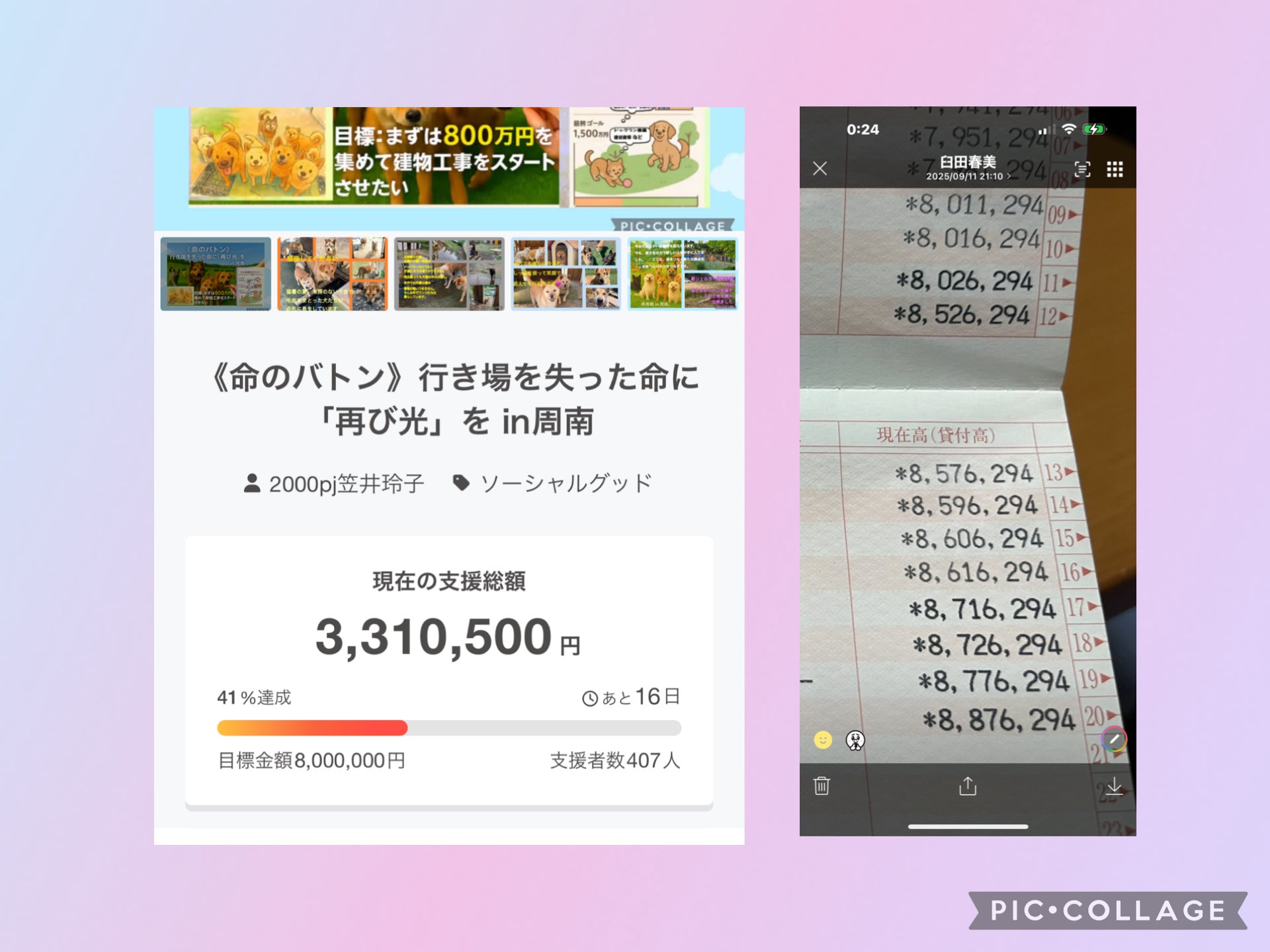 活動報告(9月12日16時半現在)皆さまからの温かいご支援が 3,310,500円 に達し、これまでに 407名 の方々にご支援いただきました。心より感謝申し上げます。また、通帳へ直接お振り込みくださった方々のご寄付と、前回のクラウドファンディング(※土地前金30万円を除く)を合わせると、移転のための資金口座には 8,876,294円 がございます。さらに、山口県のボランティアさんが管理してくださっている通帳には 770,000円 があり、合計で 12,950,000円(1,295万円) が集まりました。皆さまのお力でここまで積み重ねてくることができましたが、CAMPFIREの広告費用や、建物を建て移転を実現するためには、まだ十分な資金が必要です。どうか引き続きのご支援・ご協力をお願い申し上げます。私たちと共に、行き場を失った命たちに安心できる未来を届けていただければ幸いです。笠井玲子