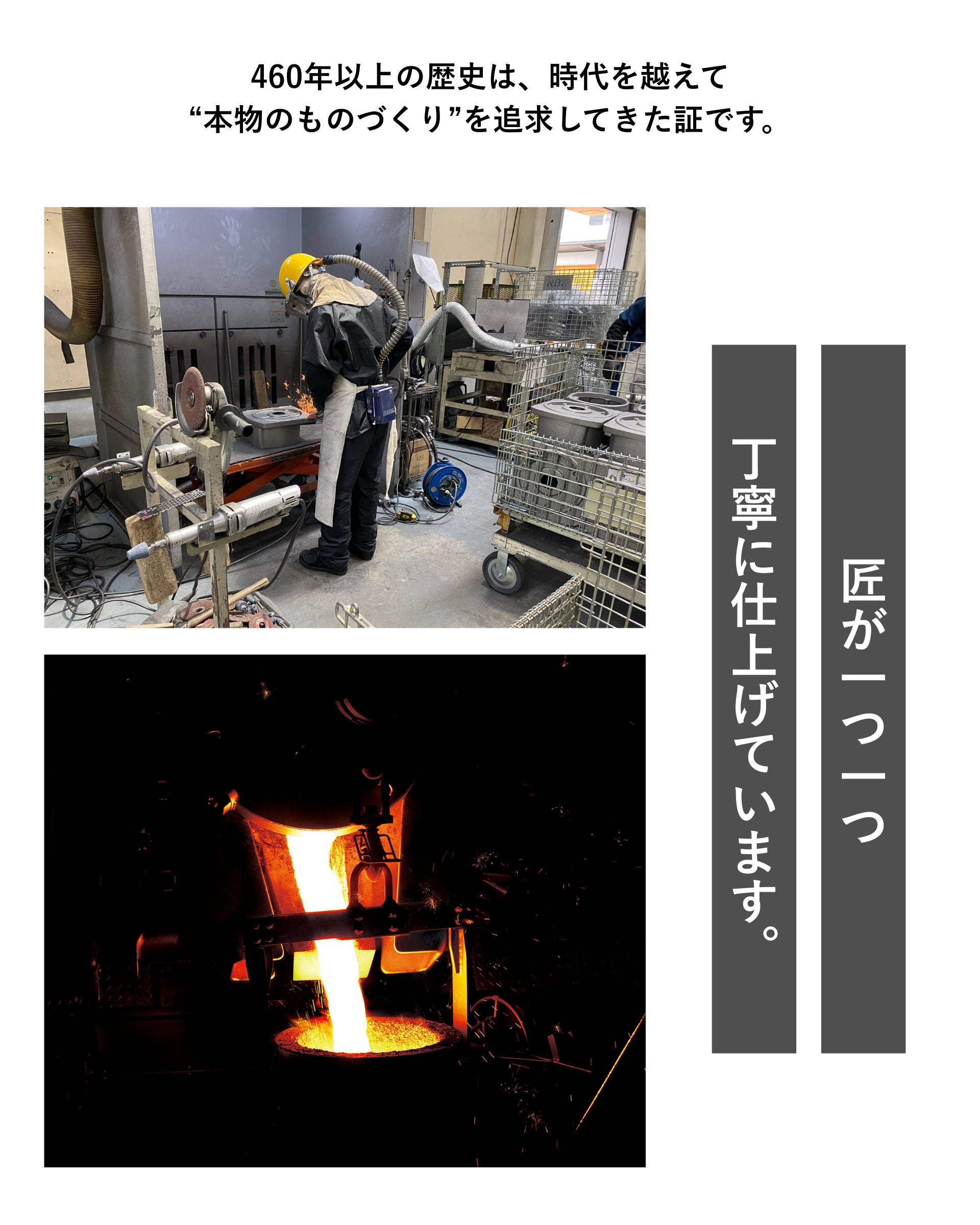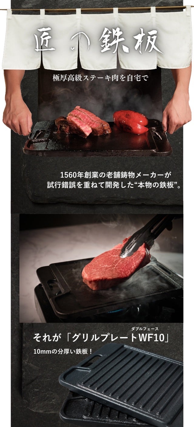 鍋屋バイテック株式会社は1560年創業、460年以上にわたり鋳物づくりを続けてきた老舗メーカーです。戦国時代から現代まで、常に時代のニーズに合わせて技術を磨き、産業用部品から日常の道具まで幅広く製造してきました。今回のグリルプレートWF10は、そんな職人の知恵と経験を詰め込んだ新たな挑戦です。460年の歴史と技術を皆さまの食卓に届けます。