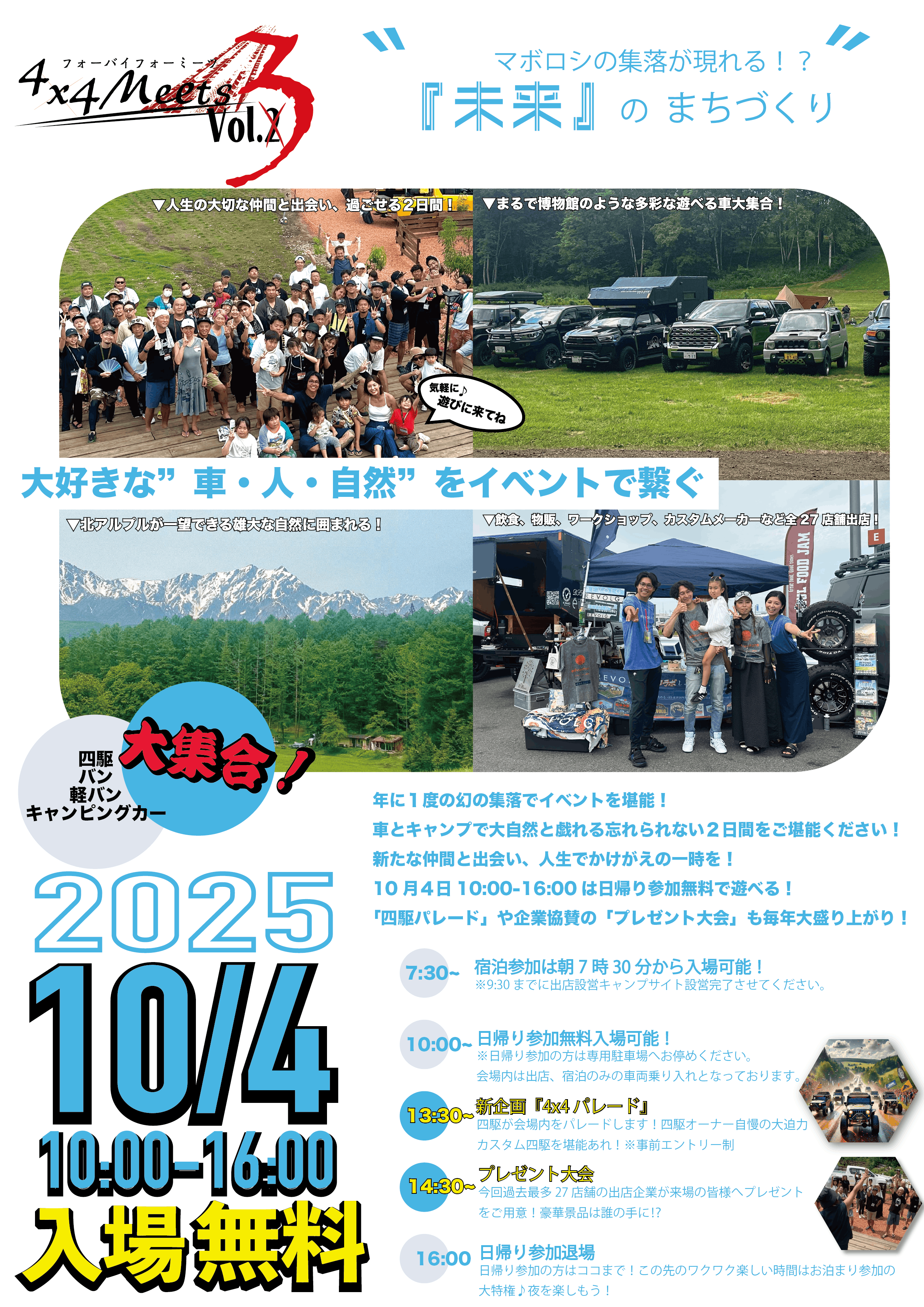 夢の『モビリティタウン』が出来るよう日々努力しております中で、皆さんにその体験版としてこのイベント「4x4Meets 」を体験していただきたいです!