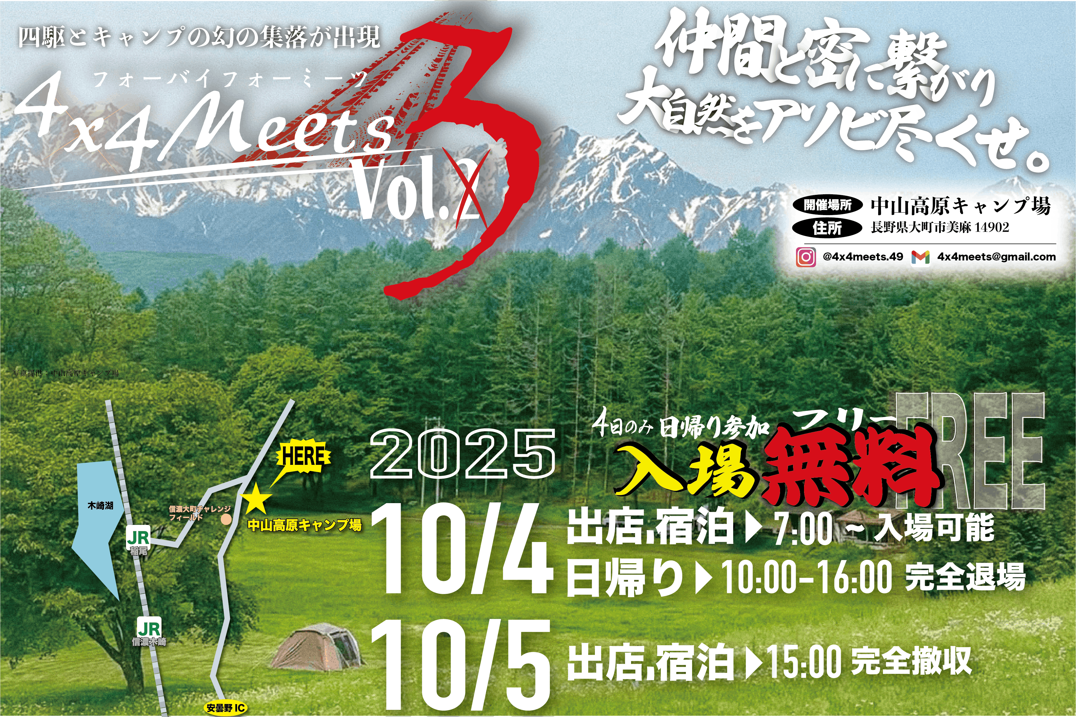 ②10月4日のみの参加の方はに帰り駐車場「ラビット駐車場」「大町チャレンジフィールド駐車場」をご利用くださいませ。日帰りの方で会場内乗り入れは「日帰り特別駐車場チケット」をお求めの方以外は駐車になれません。別途「日帰り特別駐車場チケット」をお求めください。