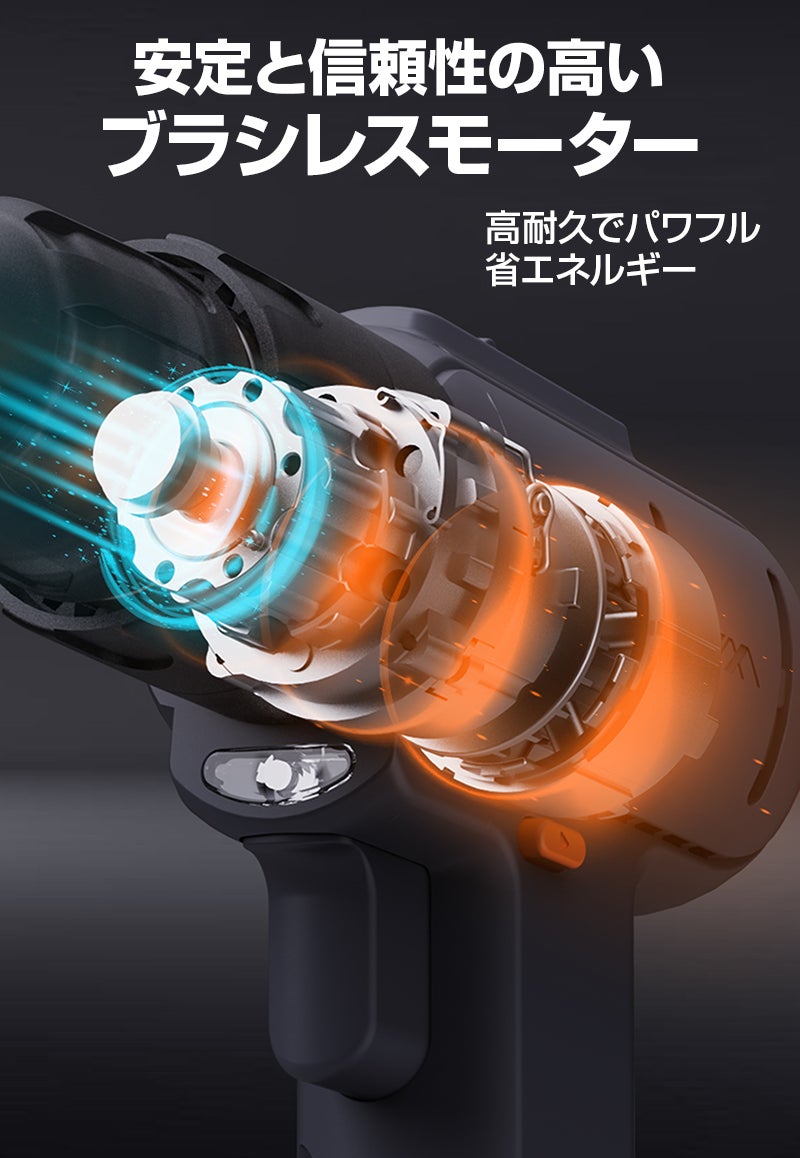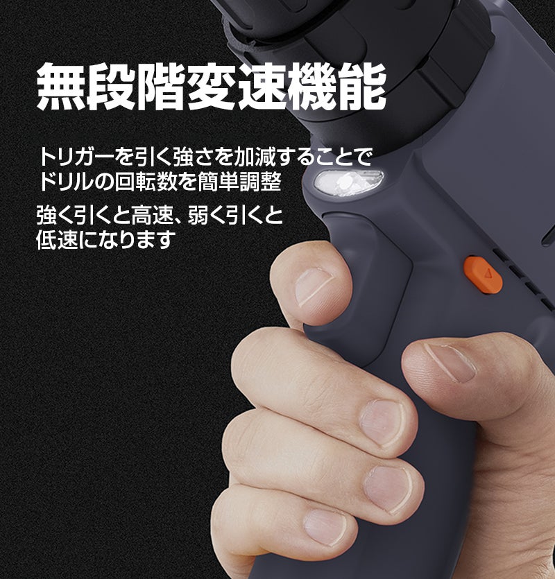 さまざまな状況や用途に対応するモードと、トリガーを引く強さで回転速度が調整できる無段階変速機能で作業をスムーズに行えます。