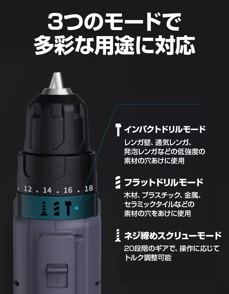 DIYや修理作業で重要なのは、素材や用途に応じて最適な工具の使い分けができることです。JIMIBOX X1-Jは、そんなニーズに応えるために「インパクトドリルモード」「フラットドリルモード」「ネジ締めスクリューモード」という3つのモードを搭載。多彩な作業に対応できる便利なツールとして活躍します。
