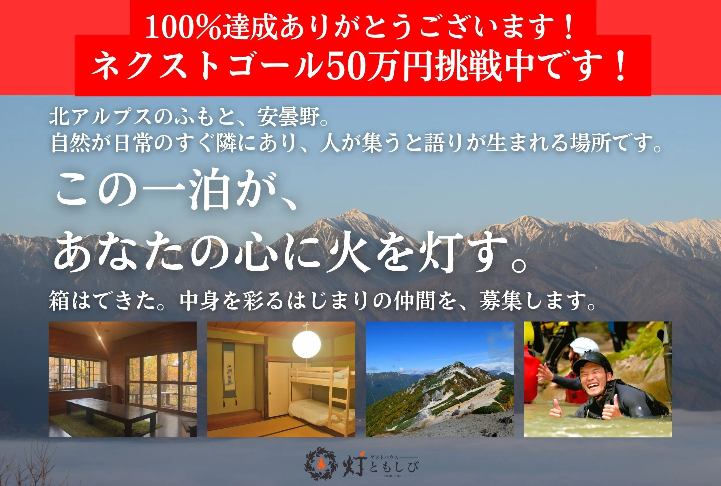 2026/01/02 20:41クラウドファンディング公開からここまで、本当に多くの応援をありがとうございます。公開から間もない中で、なんと現在目標金額の80%に到達しました。正直なところ、年末年始という忙しい時期に重なり、「どれくらい届くのだろう…」という不安もありました。それでも、・これまで宿に関わってくれた方・SNSを通じて見守ってくれていた方・まだ訪れたことはないけれど共感してくれた方たくさんの“灯”が集まり、ここまで来ることができました。本当にありがとうございます。今回のクラウドファンディングは、宿の開業資金を集めるためのものではありません。すでにゲストハウス〈灯〉は開業しています。それでも、あえてクラウドファンディングという形を選んだのは、この場所を「はじまりの仲間」と一緒につくりたいと思ったからです。食卓を囲んで話す時間、自然の中で少し肩の力が抜ける瞬間。そんな時間を、「泊まりに来た人」だけのものにしたくなかった。この場のはじまりに立ち会い、それぞれの場所で生きながら、またふと思い出して戻ってこられる場所にしたい。そのためのクラウドファンディングです。80%まで来て正直に言うと、ここまで来て「数字」以上に嬉しかったのは、「あの時間、よかったよ」「行けなくても、応援したいと思った」そんな言葉をたくさんもらえたことでした。この宿で生まれた時間が、誰かの中にちゃんと残っていたんだと知れたことが、何よりの励みです。まだ、はじまりの途中です現在、クラウドファンディングは残り20%。まだ、参加できる席があります。・これから行ってみたいと思っていた方・気になっていたけれど、タイミングを逃していた方・「今は忙しいけど、落ち着いたら行きたい」と思っていた方今回のリターンは、前売りの宿泊券・体験券としても使えるものが中心です。無理に応援する必要はありません。ただ、「いつか行きたい」が少しでもあるなら、このタイミングで参加してもらえたら嬉しいです。最後まで読んでくださり、ありがとうございます。この場所が、これからも静かに灯り続けられるよう、引き続き見守っていただけたら幸いです。また進捗があり次第、活動報告でお知らせします。 もっと見る