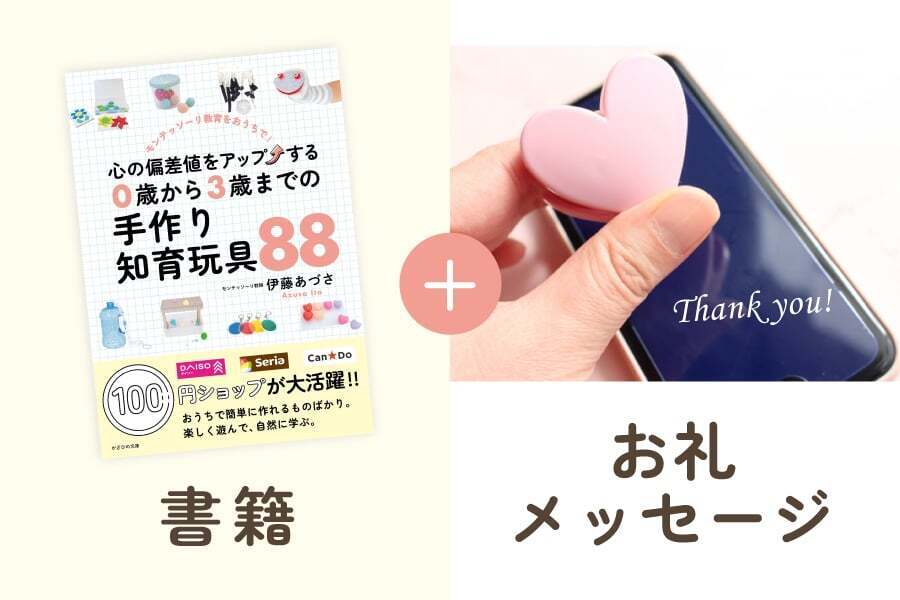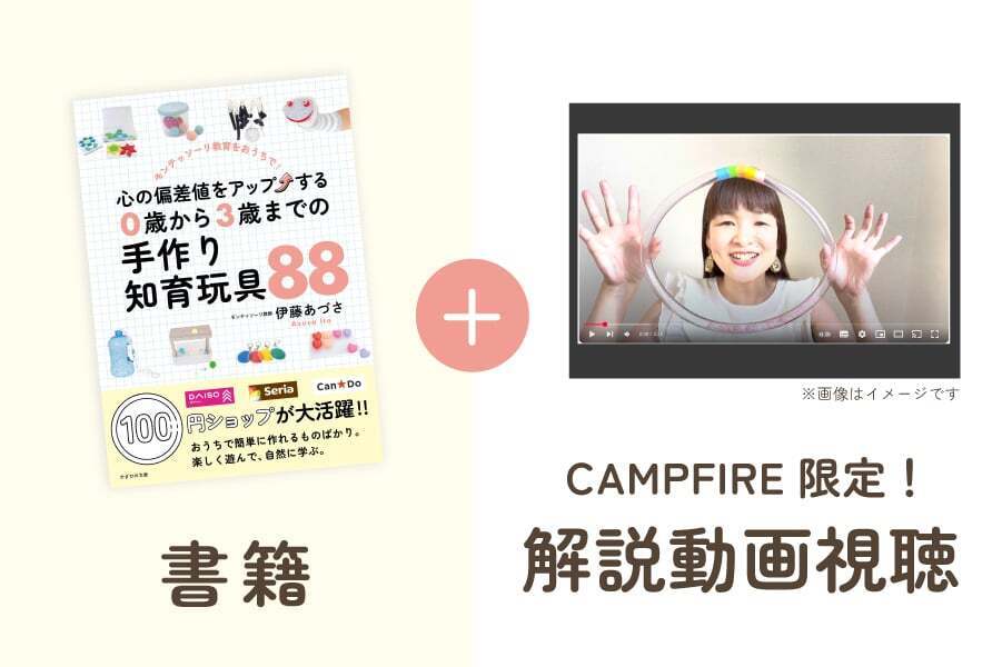 まず気軽に応援いただける方には、新刊『心の偏差値をアップする。0歳から3歳までの手作り知育玩具88』とお礼のメッセージをお届けします(3,000円)。さらに本を深く理解したい方には解説動画付き(5,000円)、直接学びたい方にはオンラインセミナーに参加できるコース(10,000円)もご用意しました。