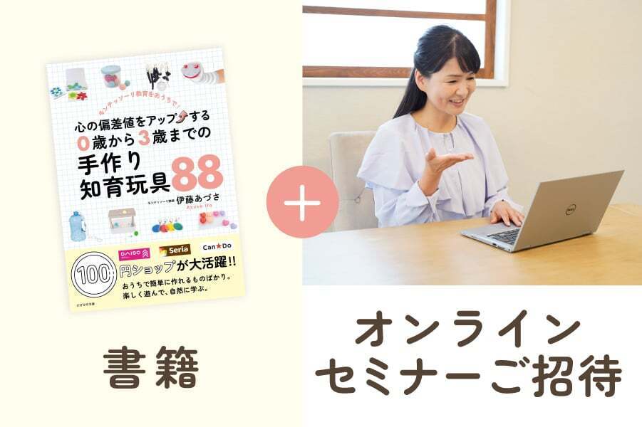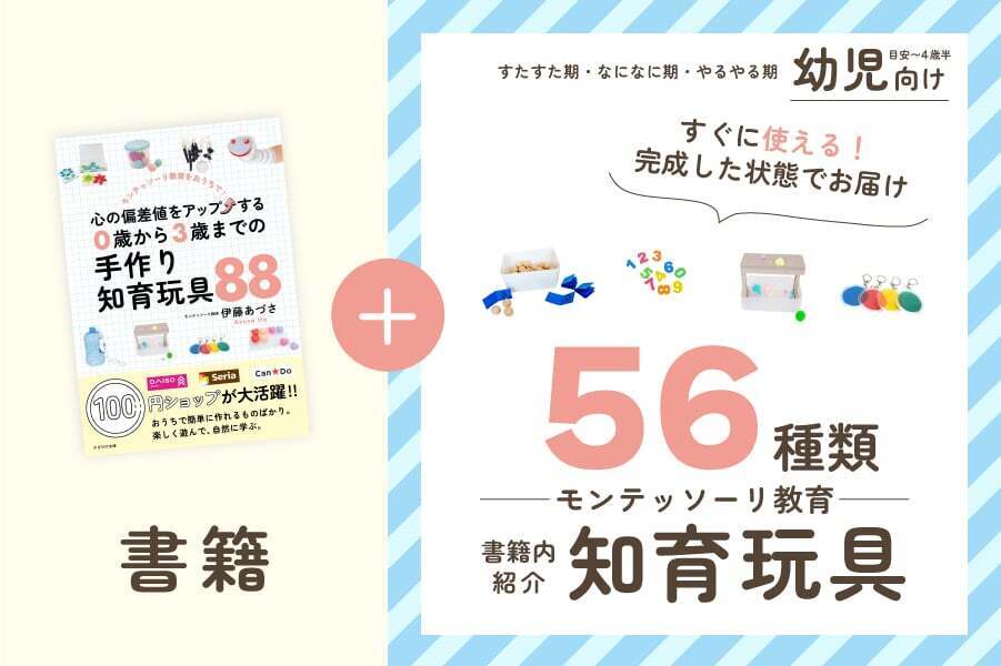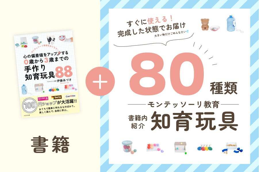 新刊『心の偏差値をアップする。0歳から3歳までの手作り知育玩具88』では、100円ショップでそろう身近な材料で作れる知育玩具を紹介しています。