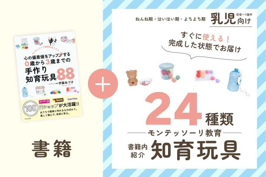 新刊『心の偏差値をアップする。0歳から3歳までの手作り知育玩具88』では、100円ショップでそろう身近な材料で作れる知育玩具を紹介しています。