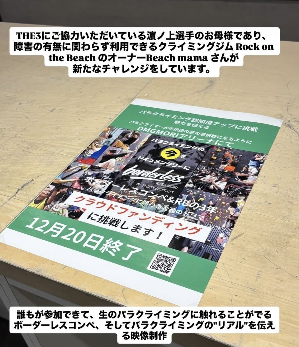 改めてご挨拶致しますこのクラファンはイベントを開催するための資金集めではなく、記録として残し社会に発信することを目的としています。思いに共感下さった方々とその思いを載せたドキュメンタリーを社会に発信していく!様々な考え、価値観がある中で同じ思いをして下さる方で共同作品にする事に意味がありますパラクライミングは、「挑戦することの価値」を体現する競技でありながらその大きな可能性に反しまだ社会に届く機会は多くありません。本プロジェクトは競技やイベントを”感動的に切り取る”ことではなく葛藤や支える人との関係性、一般クライマーが体感することで何を感じるかを含めて記録し今後も繰り返し見られる形で残すことを目的としています皆様のお力本当に感謝しています残り2日走ります!
