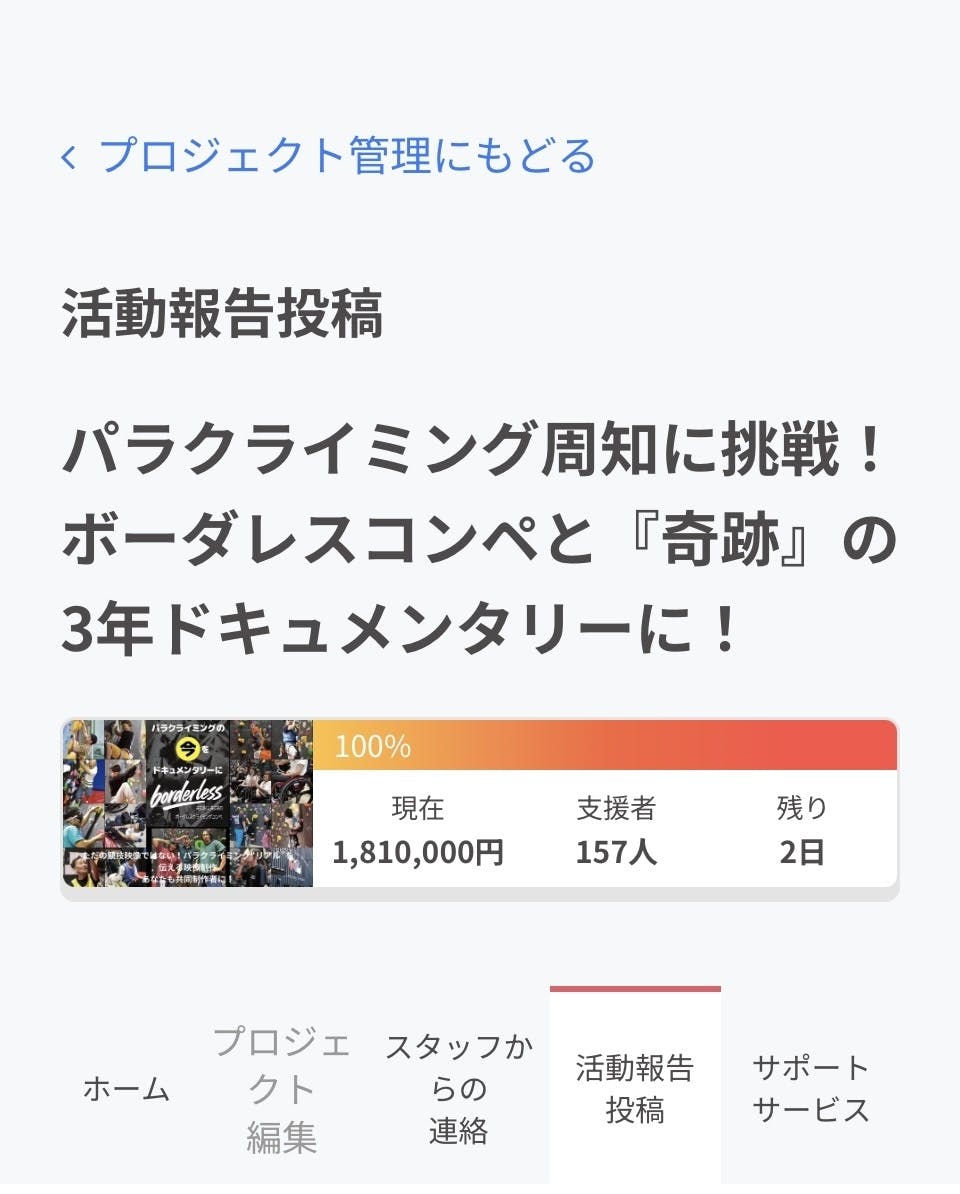 2025/12/18 09:54改めてご挨拶致しますこのクラファンはイベントを開催するための資金集めではなく、記録として残し社会に発信することを目的としています。思いに共感下さった方々とその思いを載せたドキュメンタリーを社会に発信していく!様々な考え、価値観がある中で同じ思いをして下さる方で共同作品にする事に意味がありますパラクライミングは、「挑戦することの価値」を体現する競技でありながらその大きな可能性に反しまだ社会に届く機会は多くありません。本プロジェクトは競技やイベントを”感動的に切り取る”ことではなく葛藤や支える人との関係性、一般クライマーが体感することで何を感じるかを含めて記録し今後も繰り返し見られる形で残すことを目的としています皆様のお力本当に感謝しています残り2日走ります! もっと見る