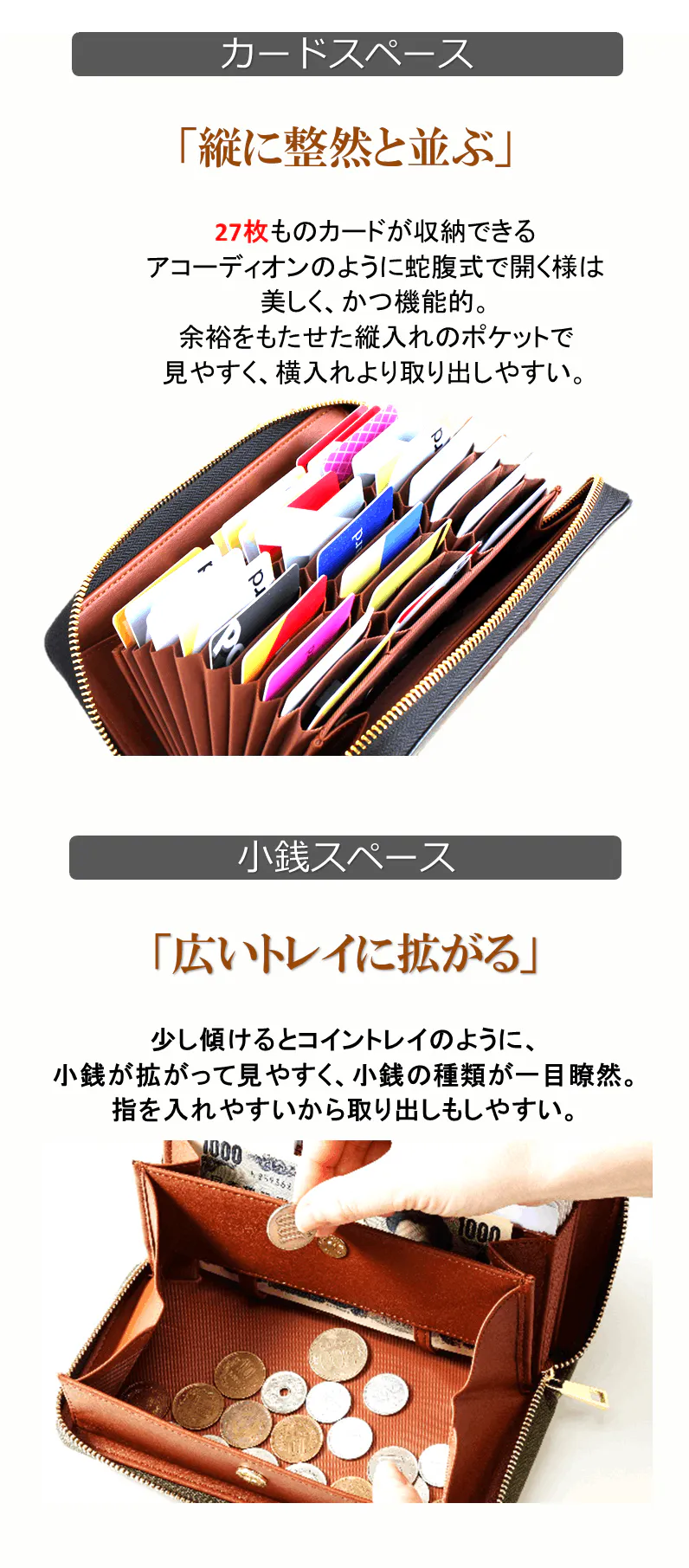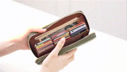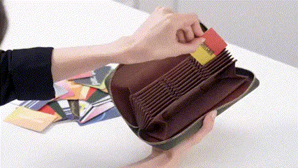 大きく開いて中身がよく分かり、欲しいカードやお札、小銭にすぐにアクセス!飛び出す絵本のように一瞬で広がり、カードがそれぞれ独立して立ち並ぶので見やすく出し入れしやすい。支払い/決済時にもたつきません。ファスナーを開けると欲しい小銭も一目瞭然!少し傾けるとトレイのようなポケットに小銭が広がるから瞬時に全体を把握できます。
