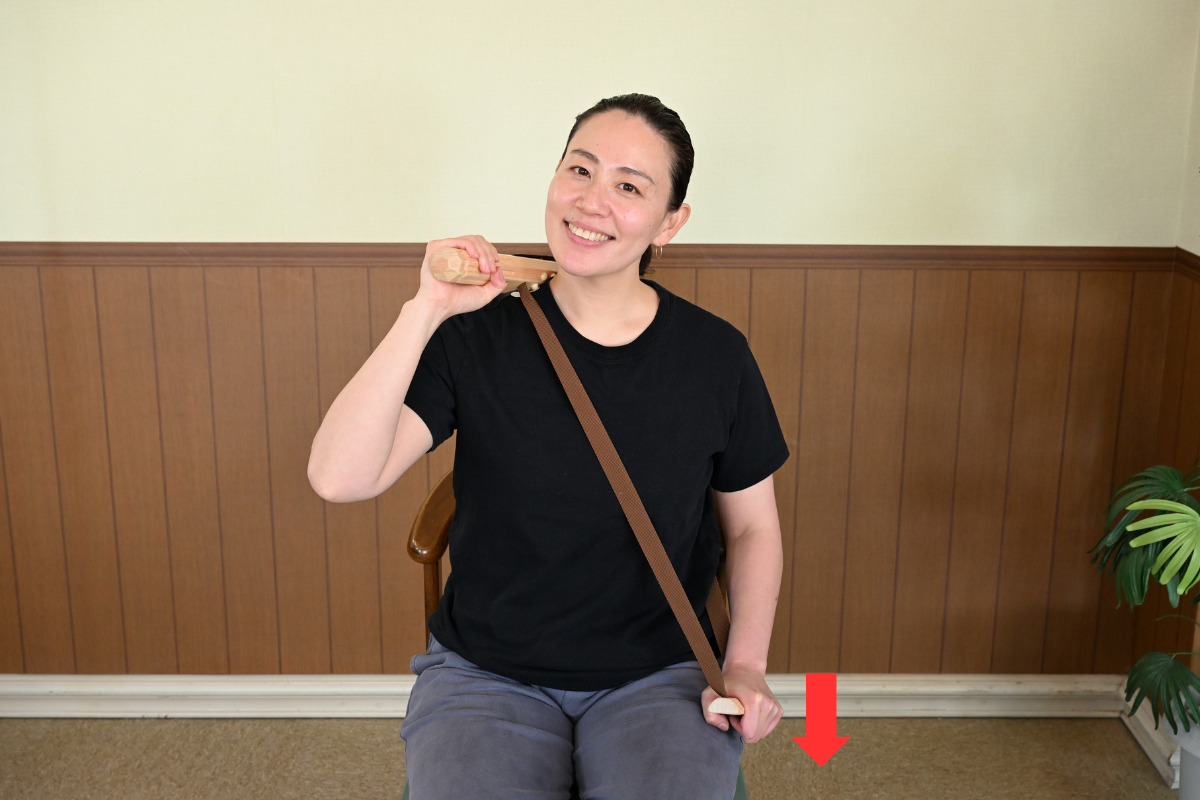 この施術法では、患者さんが座った姿勢で、我々が上から丸棒を使って肩に当て、