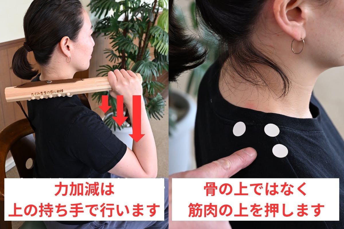 この施術法では、患者さんが座った姿勢で、我々が上から丸棒を使って肩に当て、