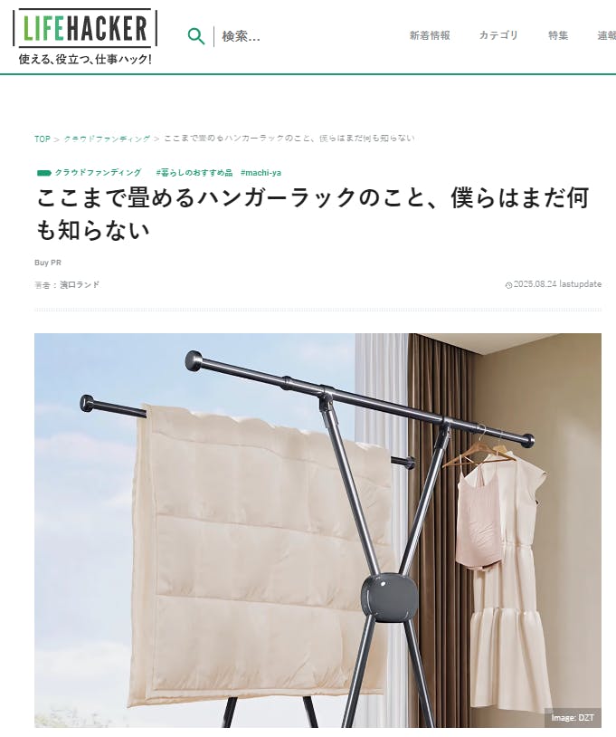 皆さまおはようございます。DZTです。 このたびは【干すも収納もこれ一台!省スペース&360°回転の革新ハンガーラック】プロジェクトに 多くのご支援を賜り、誠にありがとうございます。 おかげさまで、プロジェクト終了まで残り6日となりました。 ここまで応援いただきました皆さまに、心より感謝申し上げます。 さらに、8月24日にはLIFEHACKERにて、再び本プロジェクトをご紹介いただきました。 ご興味をお持ちの方は、ぜひ記事をご覧ください。 ▶ LIFEHACKER記事はこちら https://www.lifehacker.jp/article/machi-ya-monohoshi-additional-867062/ ▶ プロジェクトページはこちら https://camp-fire.jp/projects/867062/view 販売期間は【8月31日まで】となっております。 残りわずかな期間ではございますが、最後まで全力で取り組んでまいります。 ぜひSNSでのシェアや、ご家族・ご友人へのご紹介をいただけますと幸いです。 引き続きご支援・ご声援のほど、よろしくお願い申し上げます。 DZT