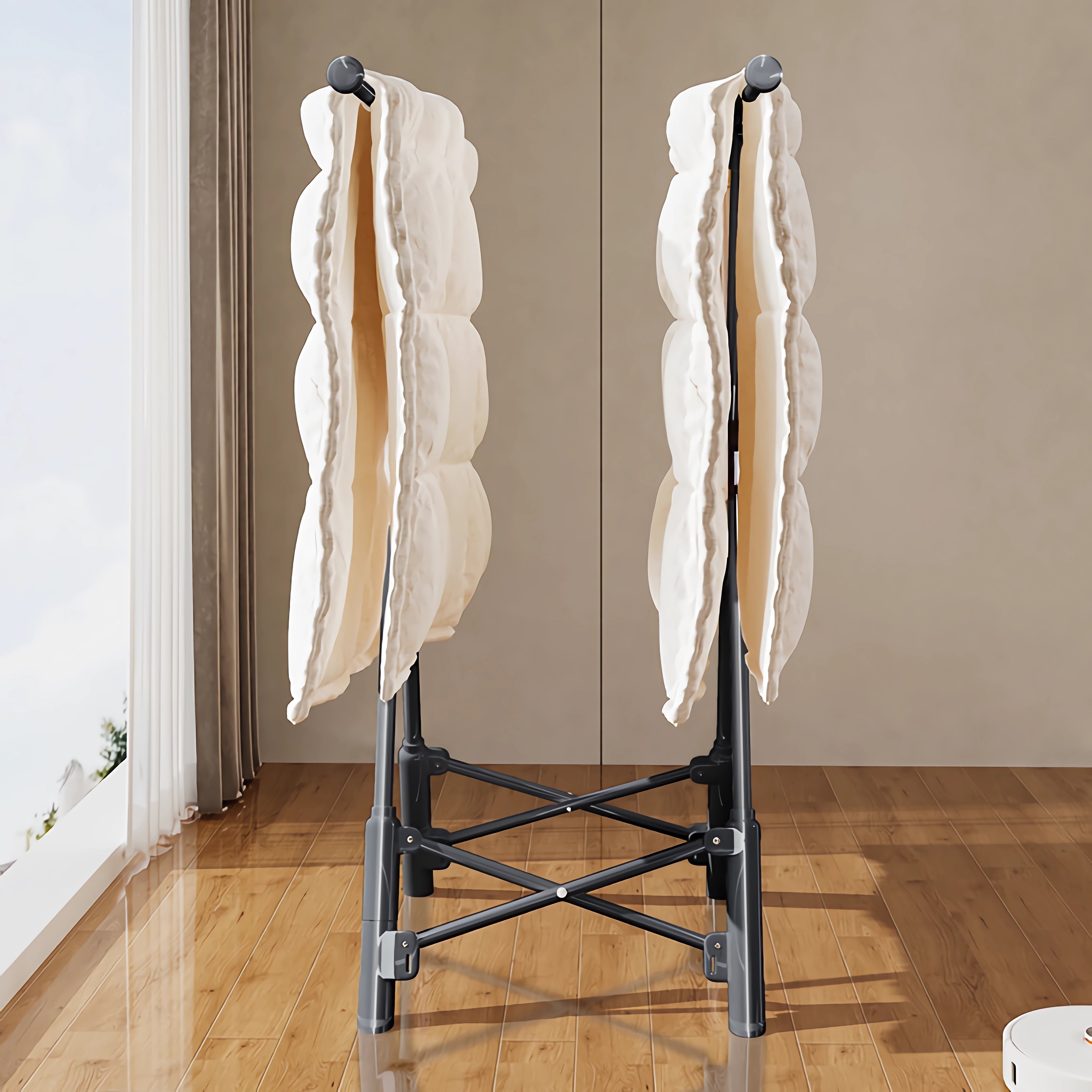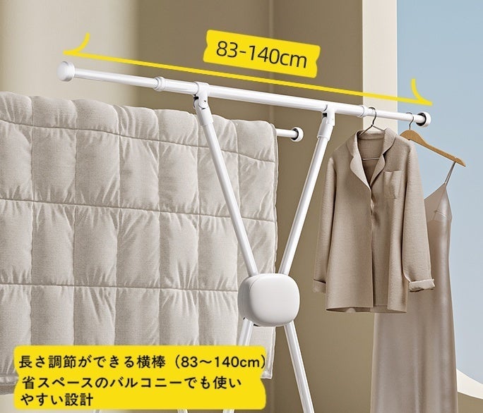 1.4mの高位置設計により、ロングスカートやワンピースも床につかずシワになりにくい仕様。さらに、布団やシーツも広々と干せて風通し抜群!衣類から寝具まで快適に乾燥できる便利なデザインです。