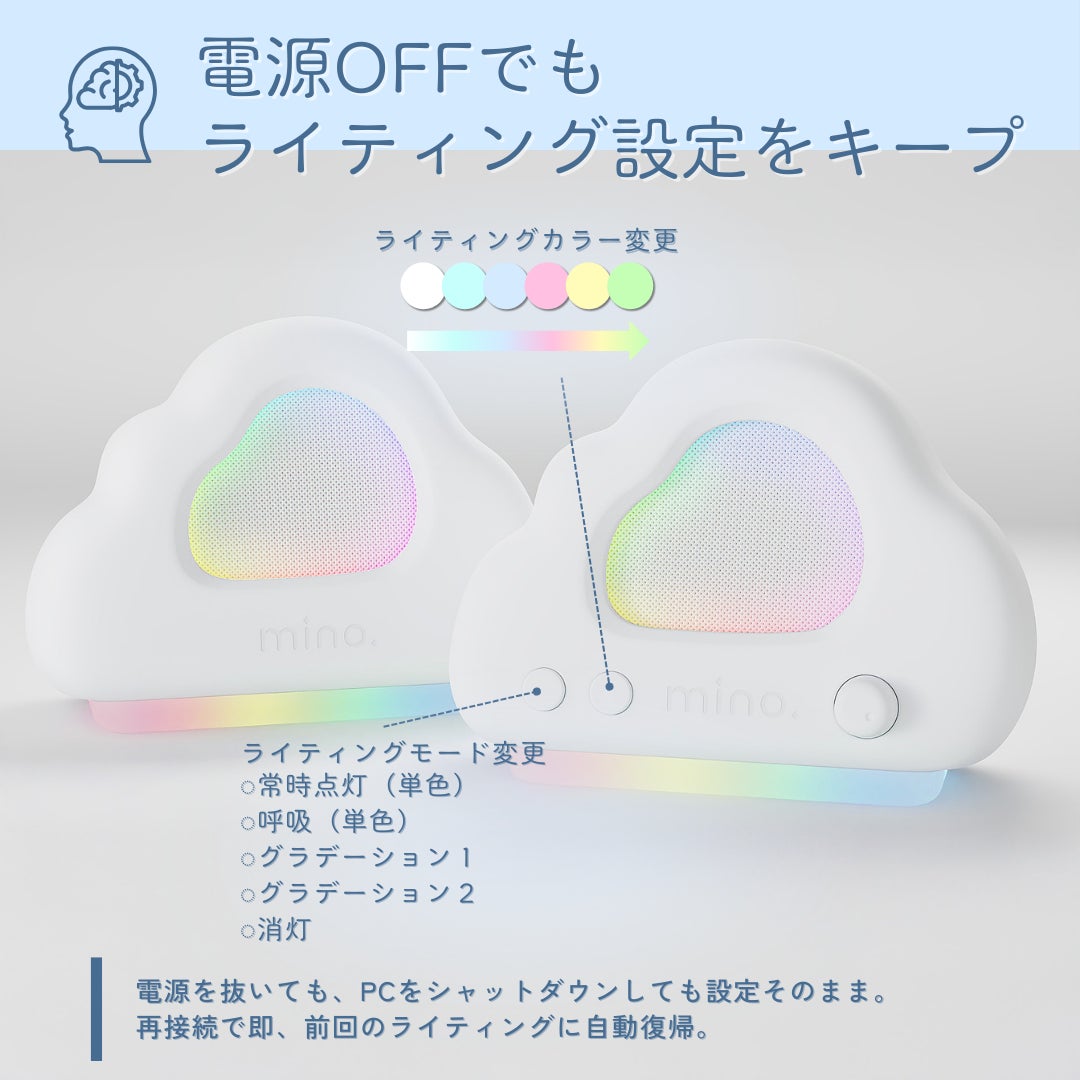 記憶保持機能:スピーカー電源接続時に前回と同じライティング設定で自動復帰