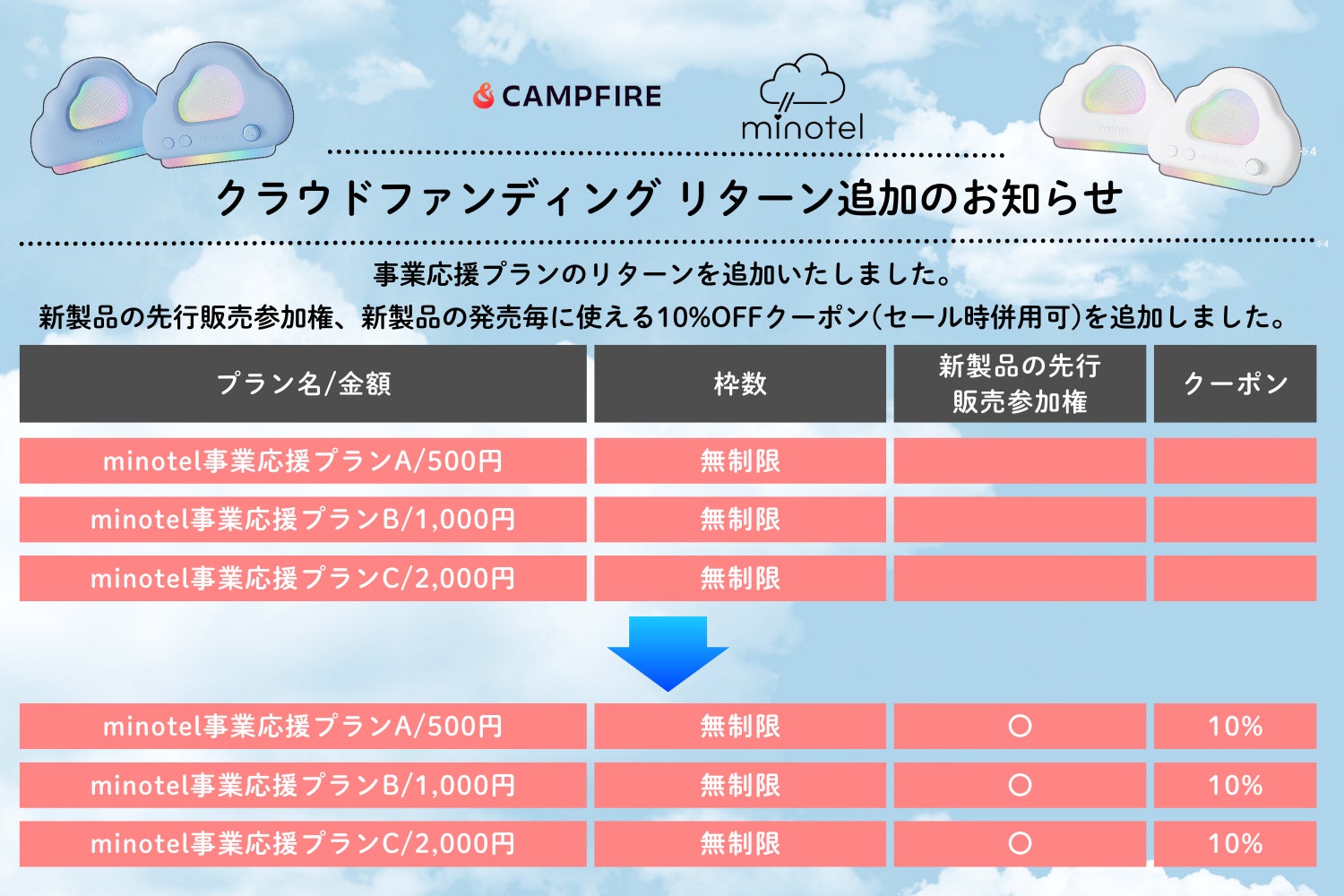 2025/12/21 21:41minotelを応援してくださる皆さまへこの度、事業応援プランのリターンを追加しました!①新製品の先行販売参加権②新製品の発売ごとに使える10%OFFクーポン(セール時併用可)minotelのこれからを、ぜひ一緒に見守ってください!※なお、クーポンは他のプランと同様に、2028年末までに発売する新製品が対象となります。(プレミアムプランは2030年末、永続プレミアムプランは期限無し) もっと見る