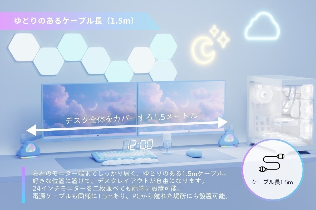 しかも、PCに繋げるUSB電源ケーブルも1.5mあるんです!なので、PCの配置に関係なく置けちゃいます。