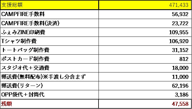 今回集まった471,433円もの支援金は、ふぇみZINEと関連グッズの制作費、ひいてはリターン品や無料配布応募の郵送費、CAMPFIREの手数料等に充てさせていただきました。
