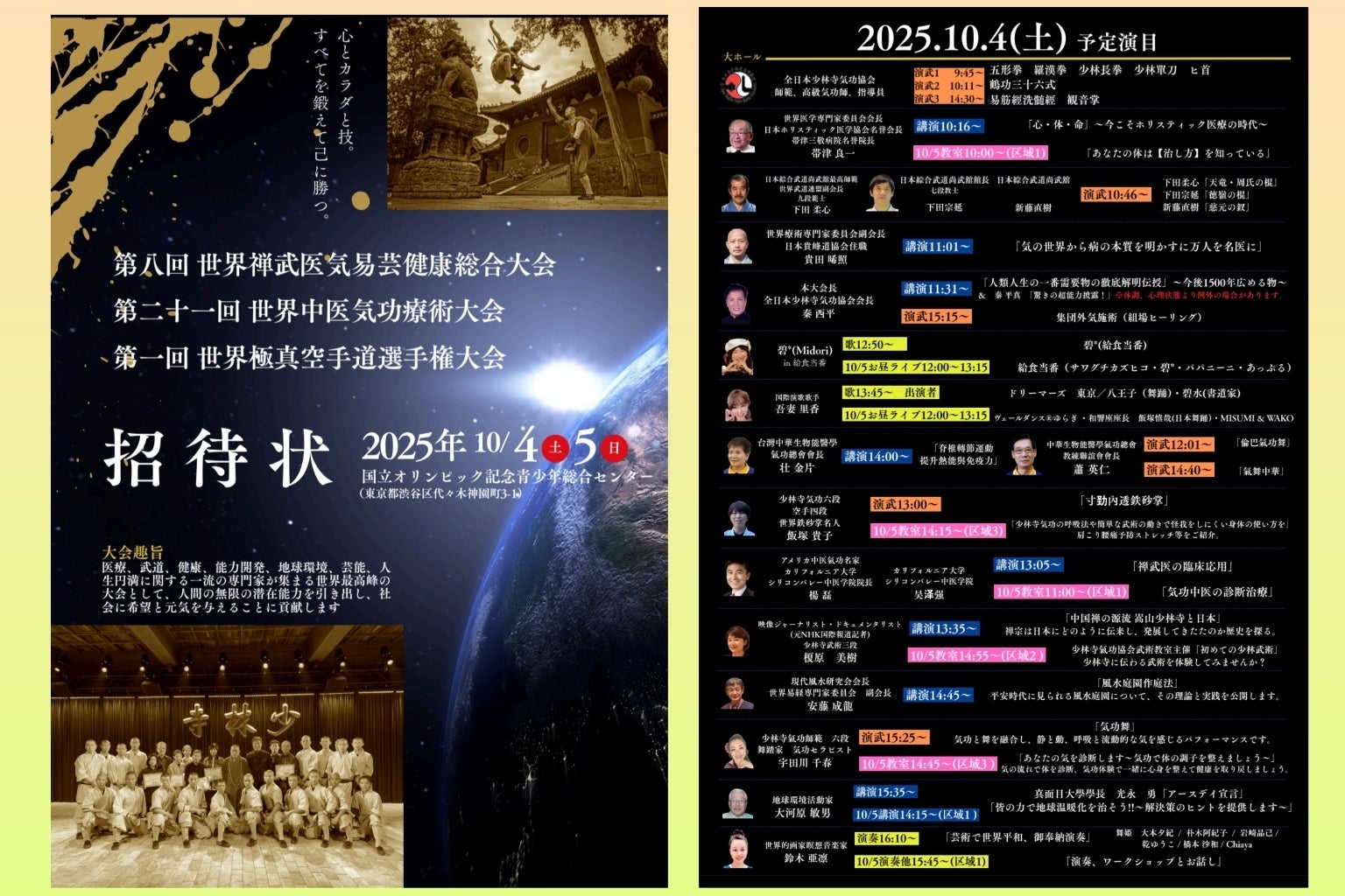 ※気功の大会(第8回世界禅武医気易芸健康総合⼤会)としては、10月4日と5日の2日間ですが、私たちが披露するのは10月4日のみで、チケットがあれば出入り自由とのことです。