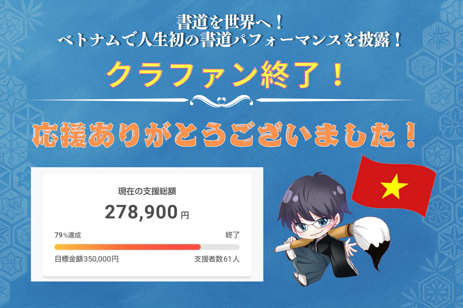 ベトナムの国営施設「ホーチミン青少年文化会館」で、越日書道交流展覧会が、2025年10月3日(金)〜5日(日)で開催される予定です!このクラファンは、展覧会での作品出展、及びパフォーマンス披露のためのイベント参加費25万円を第1目標に立ち上げました!