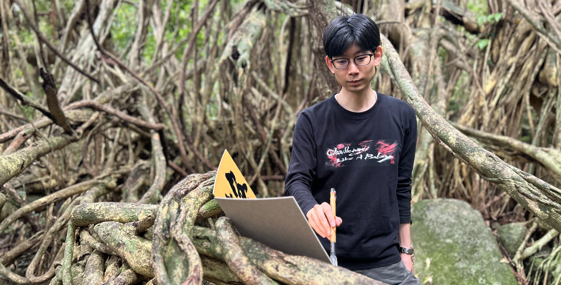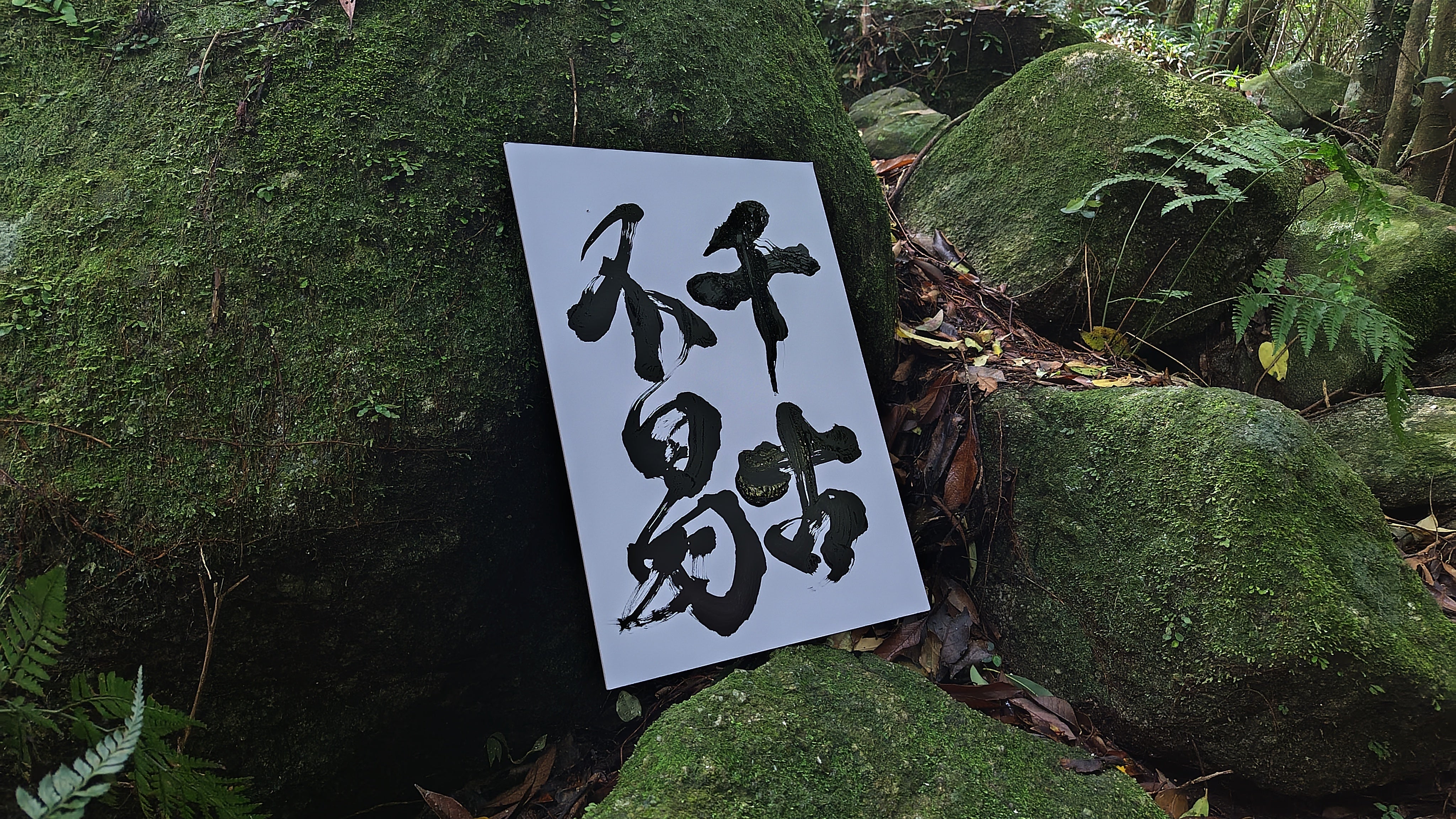 また、屋久島へ行き、屋久島の自然の中で書道をするという新しい試みをしました。昔から現在まで変わらないこと、不変であることを意味する「千古不易」!数千年にわたり生育している屋久杉の木々を念頭に表現してみました。A3パネルに書いたこの作品もベトナムで展示いたします。