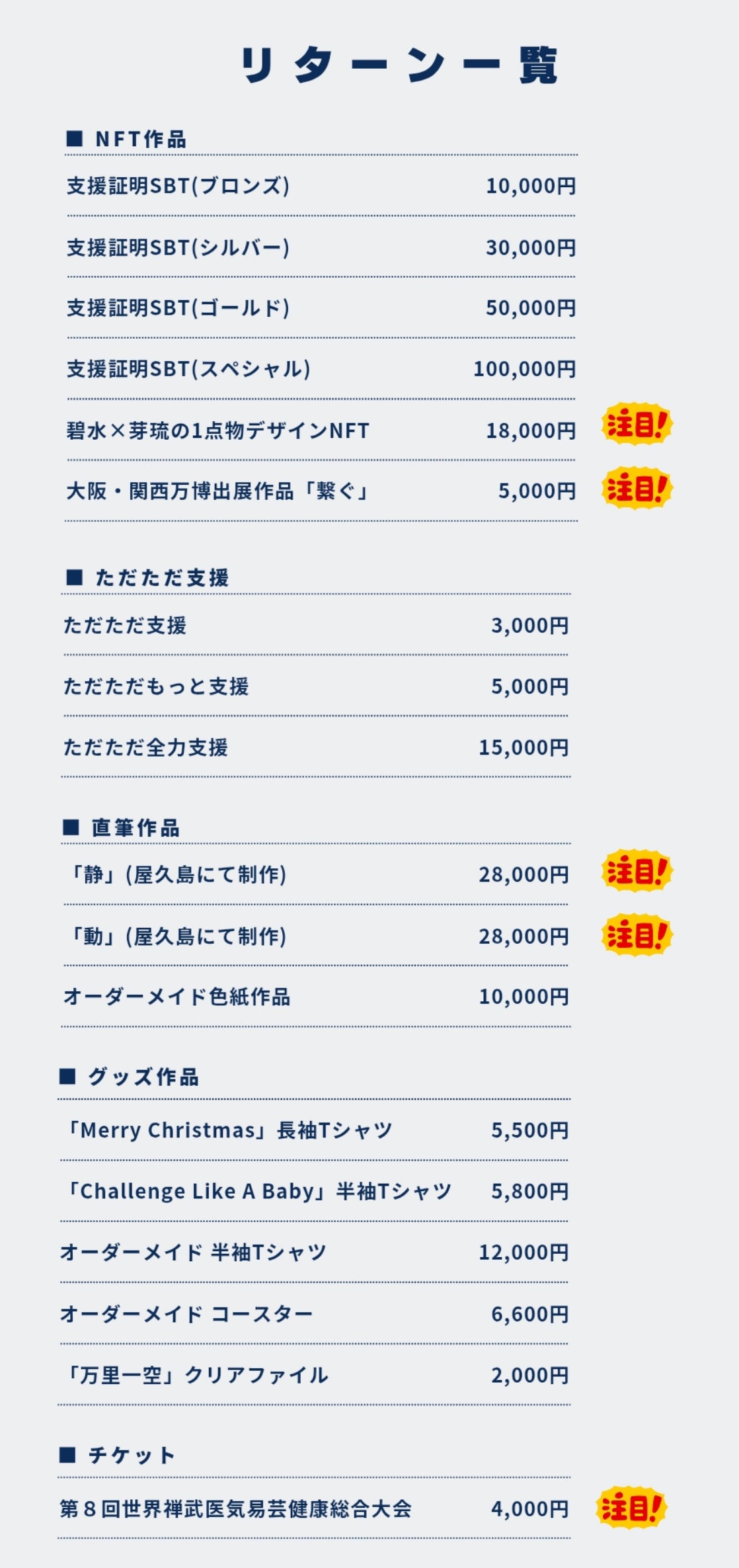下記一覧の通り、リターンをご用意しております。ちなみに、支援時に上乗せ支援も可能ですので、もっと応援したいという方がいたら、上乗せも大歓迎です📣 ❲注目!❳ を付けたリターンについて解説します♪