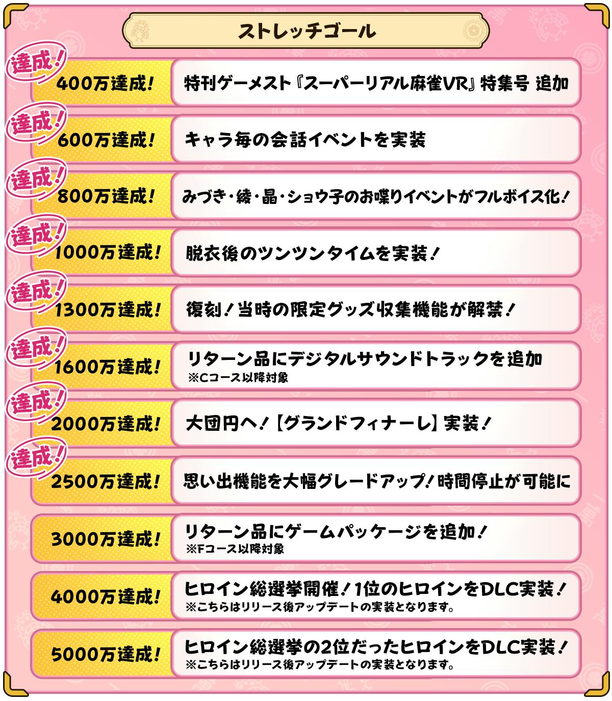 2025/12/23 13:00支援者の皆様いつも温かいご支援をいただき、誠にありがとうございます。プロデューサーの松井です。本日は『スーパーリアル麻雀 Venus Returns』のリリース時期について、大切なお知らせがございます。当初「2026年春」を予定しておりましたリリース時期ですが、「2026年夏頃」へ変更させていただくことになりました。楽しみにお待ちいただいている皆様には、お待たせしてしまうことを心よりお詫び申し上げます。■延期の理由について今回の延期は、皆様からの想像を遥かに超えるご支援の結果でもあります。クラウドファンディングでは、目標200万円に対して最終的に3,380万円ものご支援をいただきました。達成率1,690%という数字は、私たちの想定を大きく上回るものでした。この温かいご支援により、当初は予定していなかった多くの機能を実装できることになりました。・みづき・綾・晶・ショウ子のお喋りイベントがフルボイス化・脱衣後のツンツンタイムを実装・大団円へ!【グランドフィナーレ】実装・思い出実装を大幅グレードアップ!時間停止が可能にこれらはすべて、皆様のご支援があったからこそ実現できる機能です。せっかくこれだけの期待をいただいたのであれば、妥協せず作り込みたい。30年越しの復活にふさわしい作品に仕上げるため、開発期間を延長させていただく決断をいたしました。■リターン品の配送についてリターン品の配送は、予定どおり進めてまいります。・リターン品 → 2026年2月頃より順次発送予定・Steamシリアルキー → ゲーム発売の1週間前にお届け予定■最後に「早く遊びたい!」というお気持ちは、痛いほど理解しております。お待たせしてしまうことは本当に申し訳なく思います。しかし、皆様の期待に応える作品をお届けすることが、私たちの責任だと考えています。「待った甲斐があった」そう言っていただける作品を必ずお届けします。もうしばらくお時間をいただけますと幸いです。引き続き、開発の進捗は活動報告にてお伝えしてまいります。今後とも『スーパーリアル麻雀 Venus Returns』をよろしくお願いいたします。2025年12月 プロデューサー 松井健太郎 もっと見る【投稿募集】ゲーメストの読者投稿は残り3日!(12月21日まで)