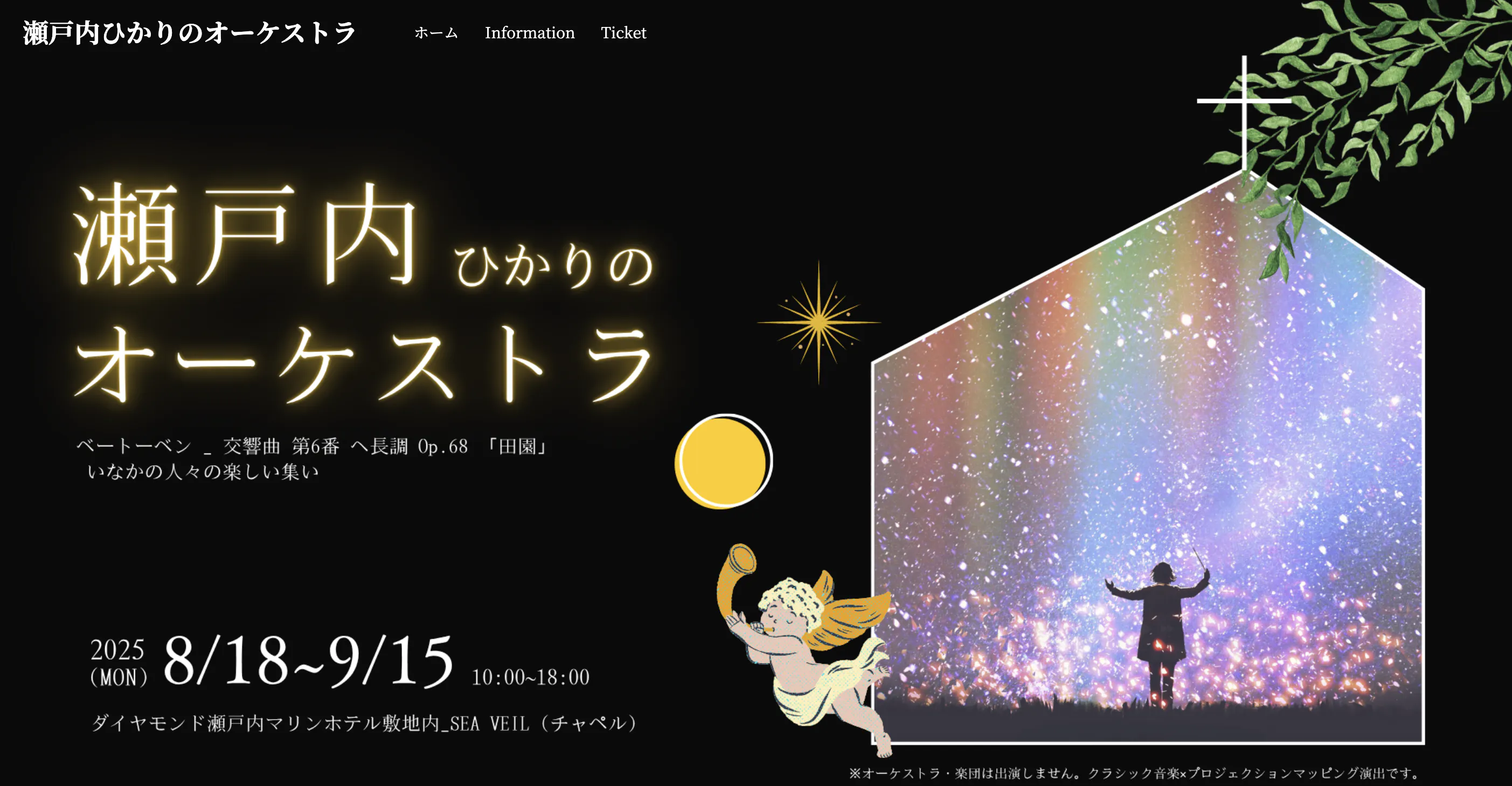 『瀬戸内ひかりのオーケストラ』とは、8月18日〜9月15日までの1ヶ月間、ダイヤモンド瀬戸内マリンホテルにて開催される、クラシック音楽×プロジェクションマッピングのイベントです。