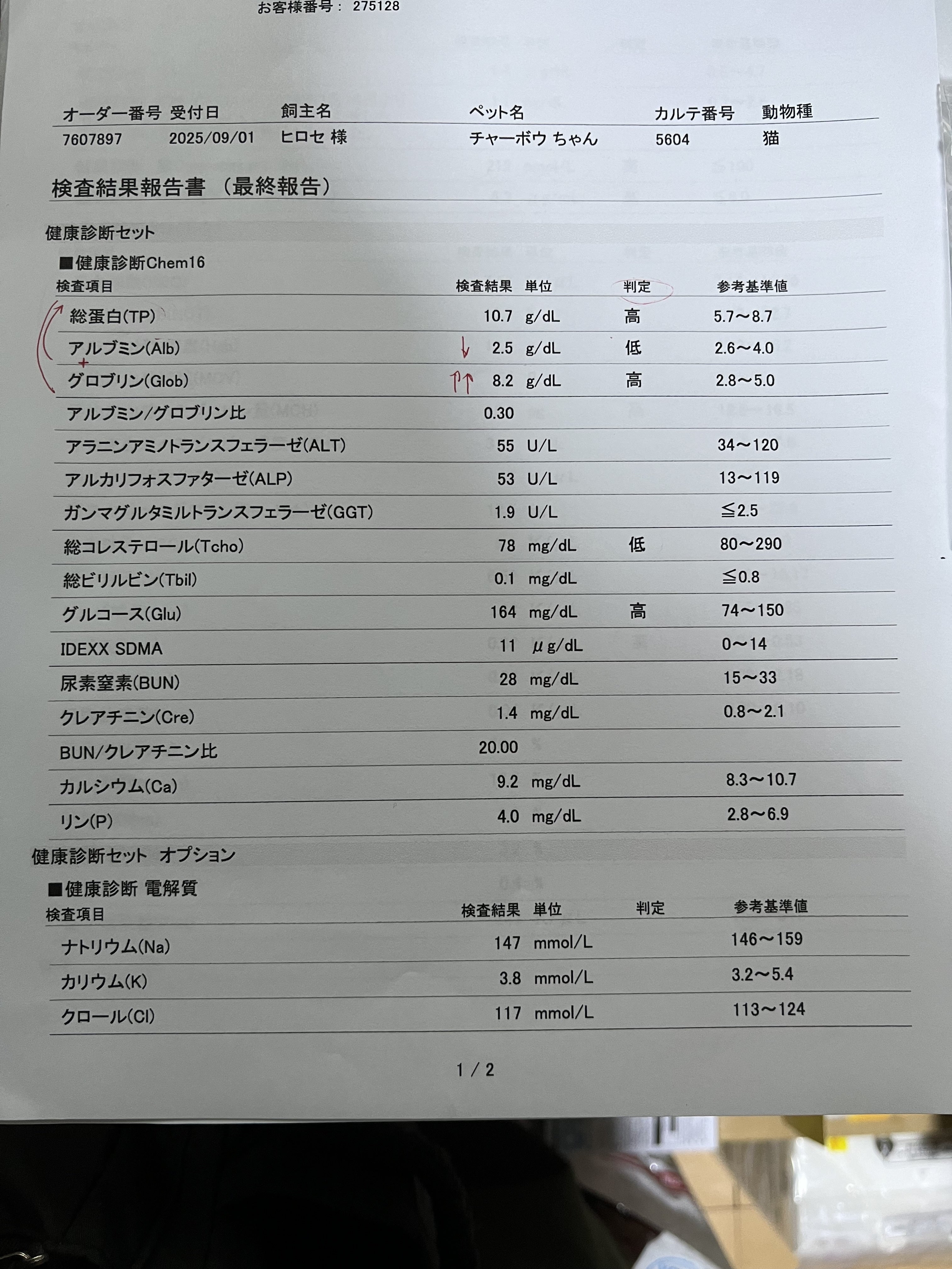 2025/09/13 08:0960名様のお力添え頂き、感謝申し上げますm(*_ _)mあと1ヶ月で保護して3年になりますm(_ _)mチャー坊の検査結果は保護当初より悪くはなっていないですが、心臓の数値が高く、不整脈の影響と思われます。アルブミンとグロブリンの数値の差が激しいのは、免疫不全を起こしているためです。猫エイズの影響と思われます。今後の治療は、自宅でステロイド注射になり、痛み止めの注射は1ヶ月の通院でしてもらえる事になりました。7本ステロイド注射を処方してもらい、冷蔵庫保存。具合悪い時に皮下注射します。これも皆様のお力添えのおかげです。本当にありがとうございますm(_ _)mチャー坊も食べたい物が食べれて満足しており、感謝しかございませんm(_ _)mありがとうございますm(_ _)m もっと見る