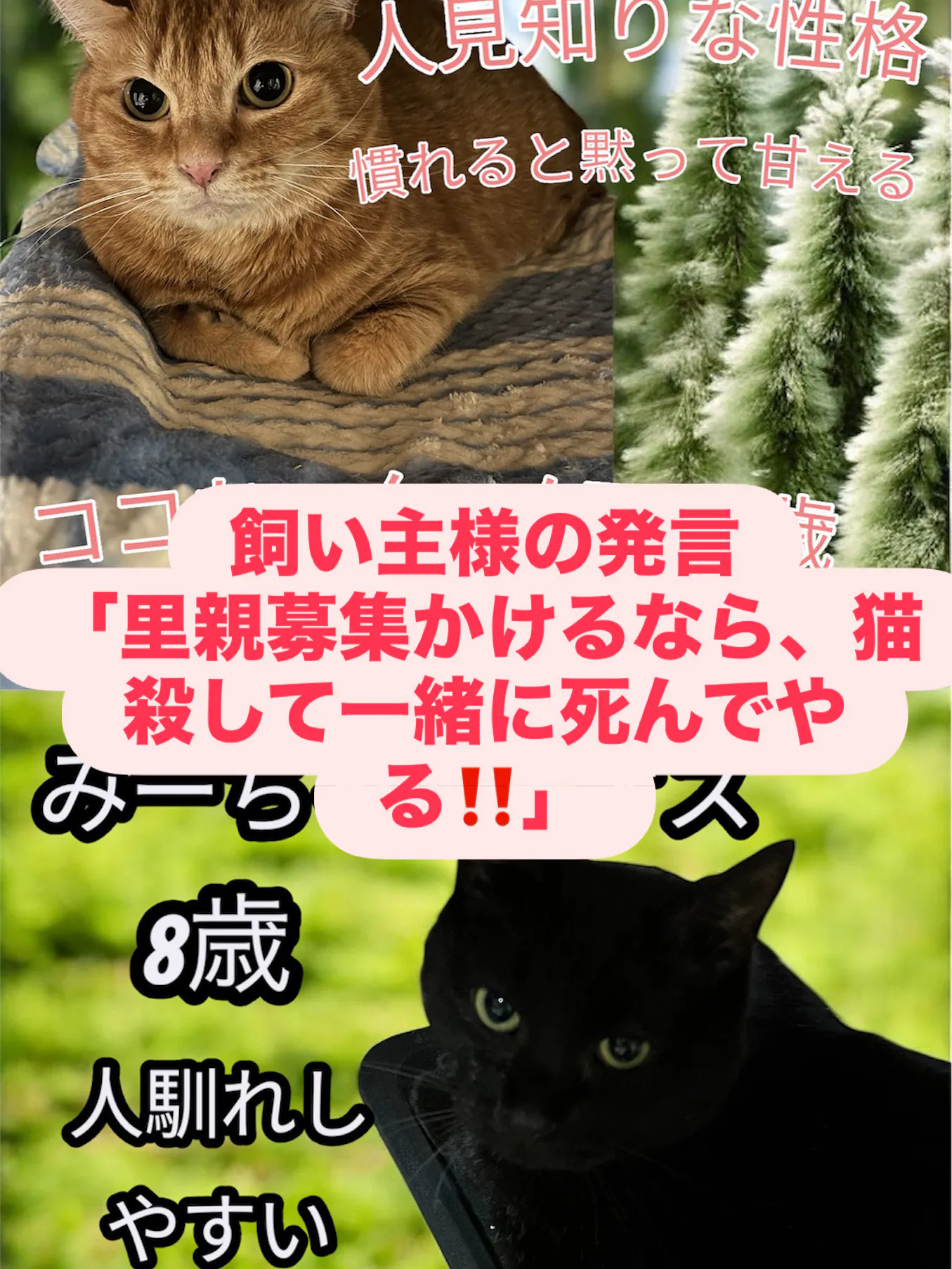 2025/09/09 02:4460名様。今回ご支援ありがとうございますm(_ _)mチャー坊とシマミちゃんにご寛大なお力添えを大変感謝申し上げますm(_ _)m並行しております隣人の猫達の保護活動ですが、進んでおりません。猫達のために、ご飯おやつ、猫砂を来月の年金から大量支援をして、現状を把握出来ました。元々お金のトラブルを起こしていた隣人です。ガス代も払えず、今度は携帯代も滞納し、携帯代本体の分割払いを一切返済という最悪な請求書が来たようで、勿論払う事が出来ず、電話も停められている状態です。電話がなければ救急車も呼べず、何かあったら、猫達の命に関わります。もし、差支えがなければ、皆様のお力添え頂いた中から、隣人の猫達みーちゃんとココちゃんの病院代に使わして頂いても宜しいでしょうか?みーちゃんは猫エイズキャリアです。ココちゃんも猫エイズ、白血病検査が必要です。すみませんm(_ _)mどうか猫達のために、使用する事をお許しくださいm(_ _)m保護への道のりになりますm(_ _)mトイレ処理も困難だそうです。早く里親探しが出来るようになったら良いなと思っておりますm(*_ _)m もっと見る