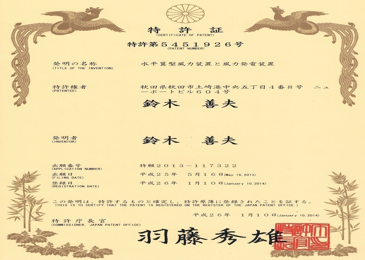 それに気付いてから風力発電4方式の内、時折、未だ実現化されていない第4の方式の研究をするようになり、ようやく11年前に「水平翼型風力装置及び風力発電装置」として特許を取得するに至りました。然しそれから研究は停滞しております。その最大要因は、この技術を公にした時、秋田県職員技術者の「こんなもの発明でも何でもない、特許は取れる訳ないだろ」との発言に代表されるように、「一地方の研究者に良い発明は出来ないだろう」との思いが普遍的になっているせいではないだろうかと考えております。