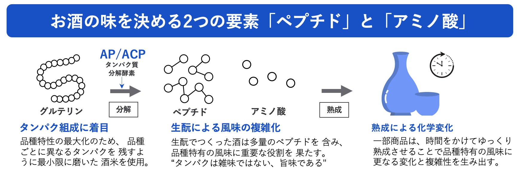 酸性化の過程では、麹由来の酸性プロテアーゼや酸性カルボキシペプチダーゼといったタンパク質分解酵素が段階的に活性化し、米のタンパク質は一度ポリペプチド(タンパク質の分解物)として蓄積されたのち、更に多様なアミノ酸へと分解されていきます。これにより旨味・甘味・苦味といった幅広い成分が生成され、複雑な味わいが形づくられます。