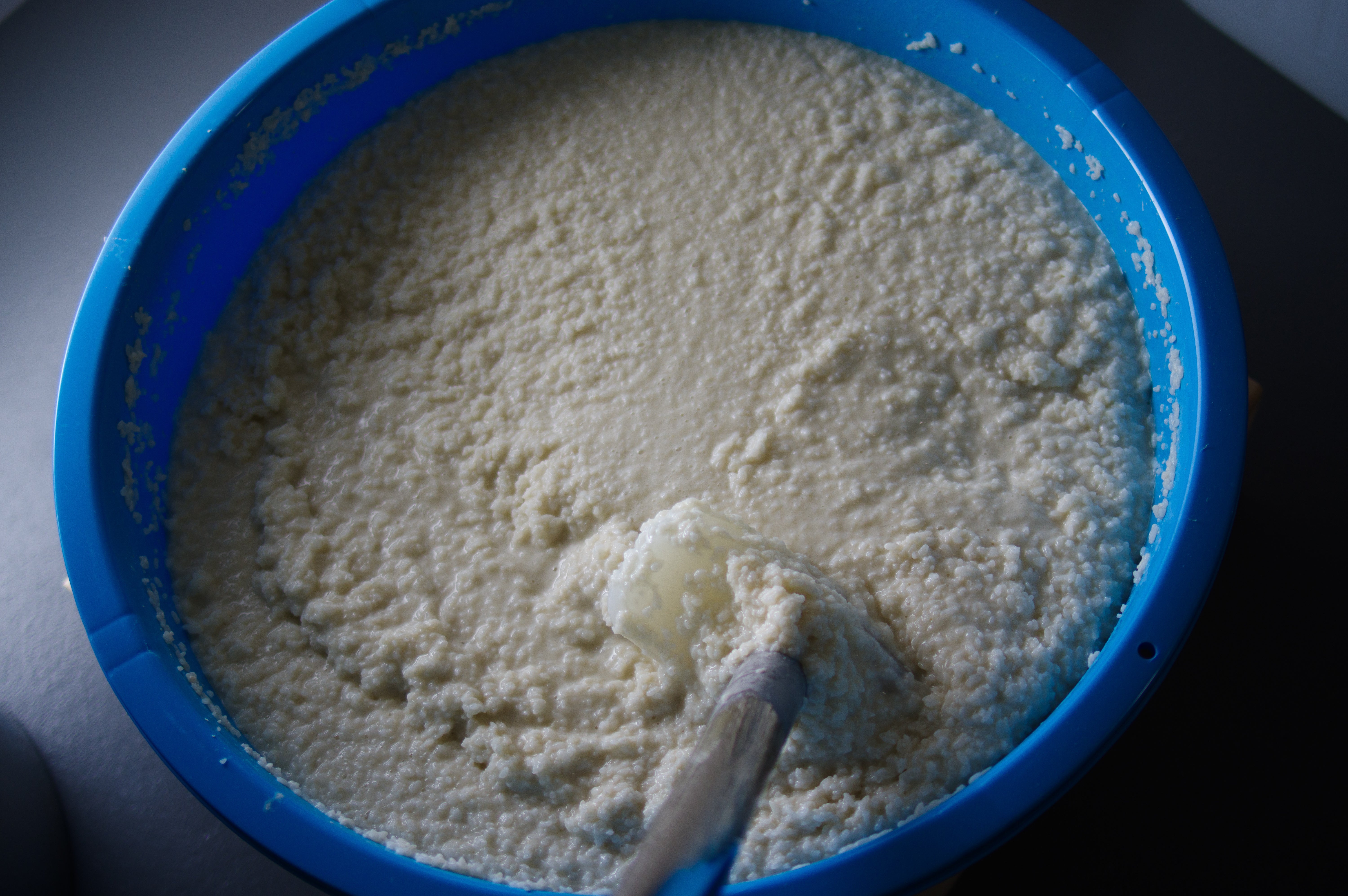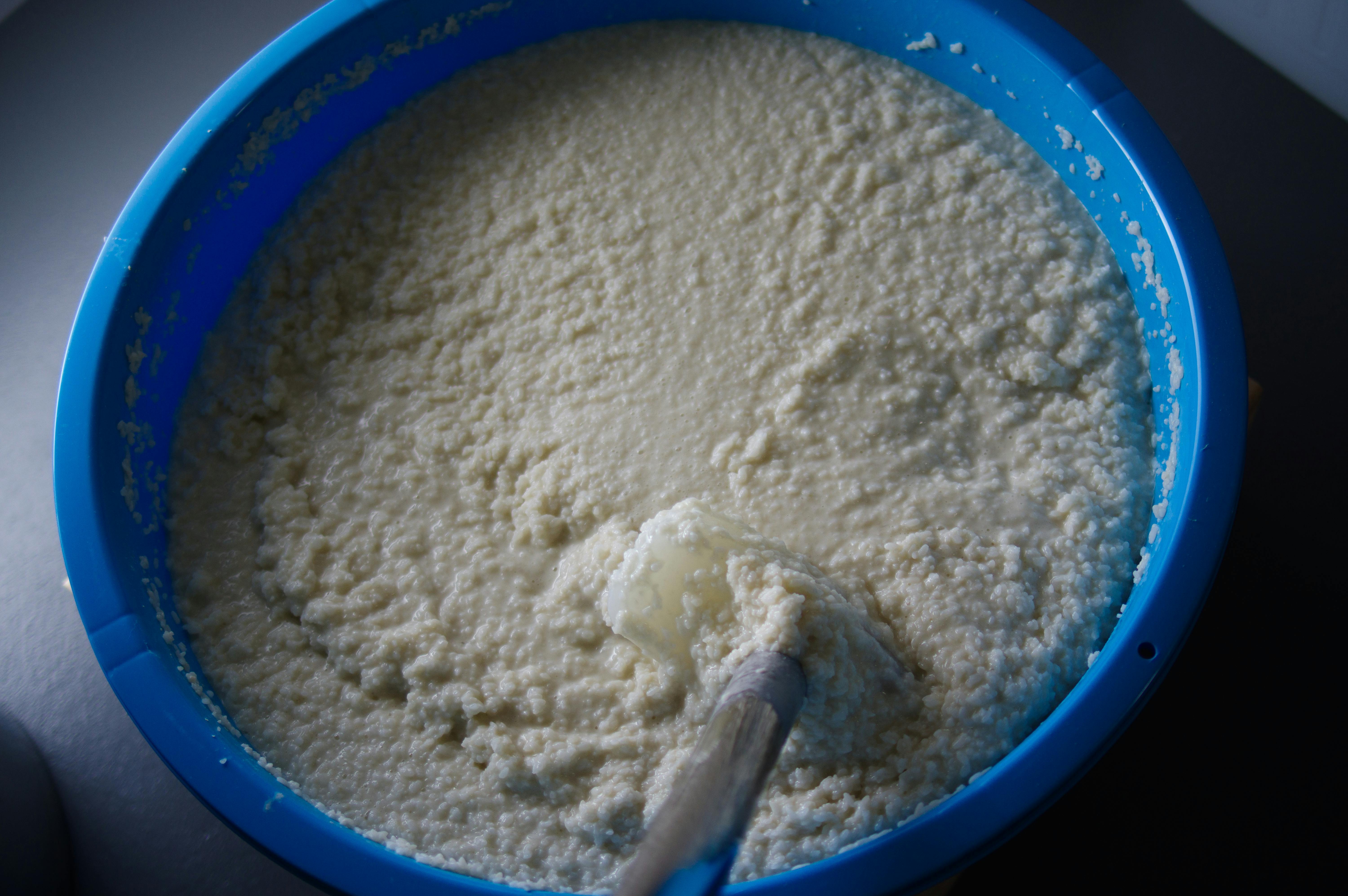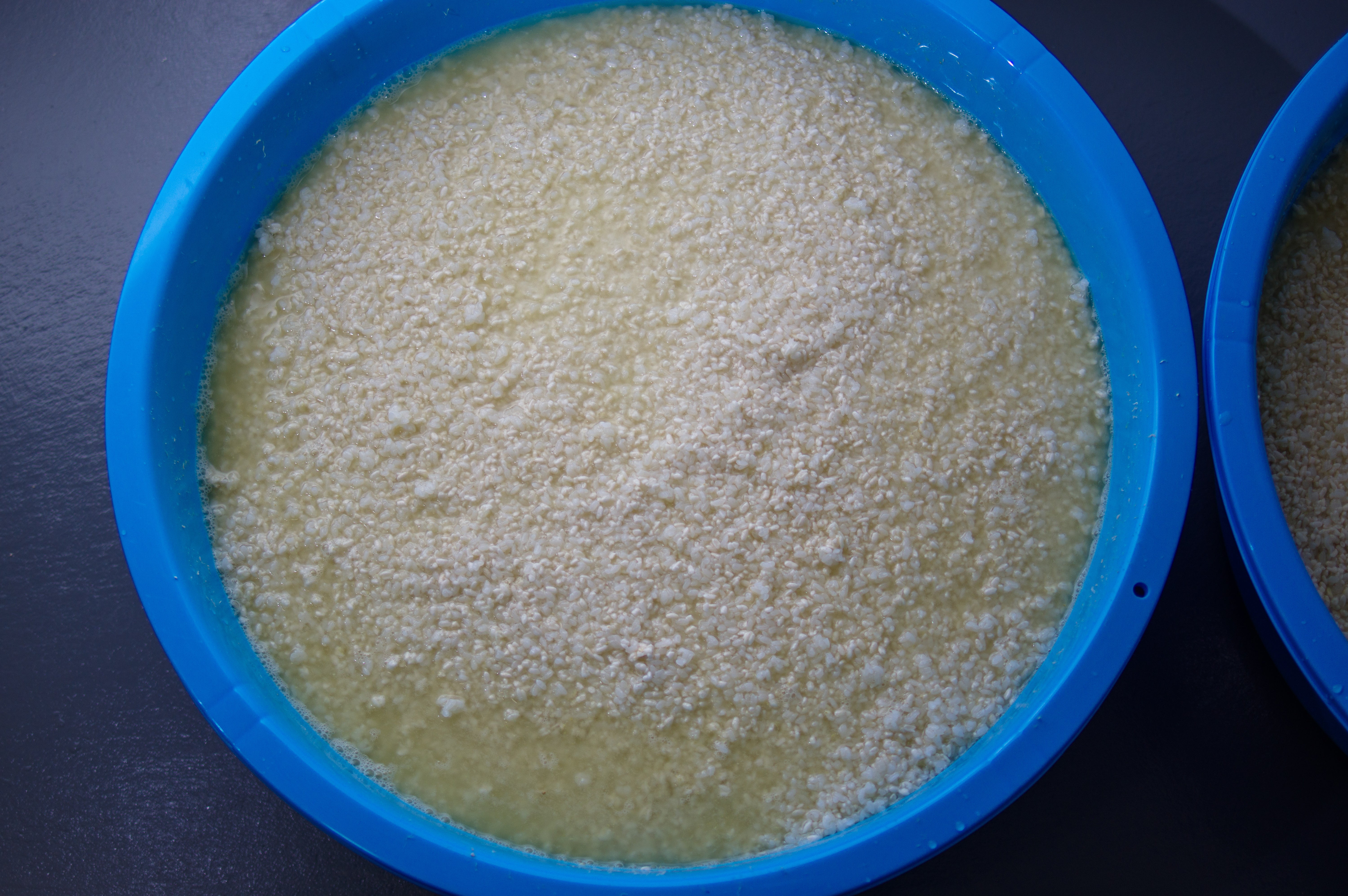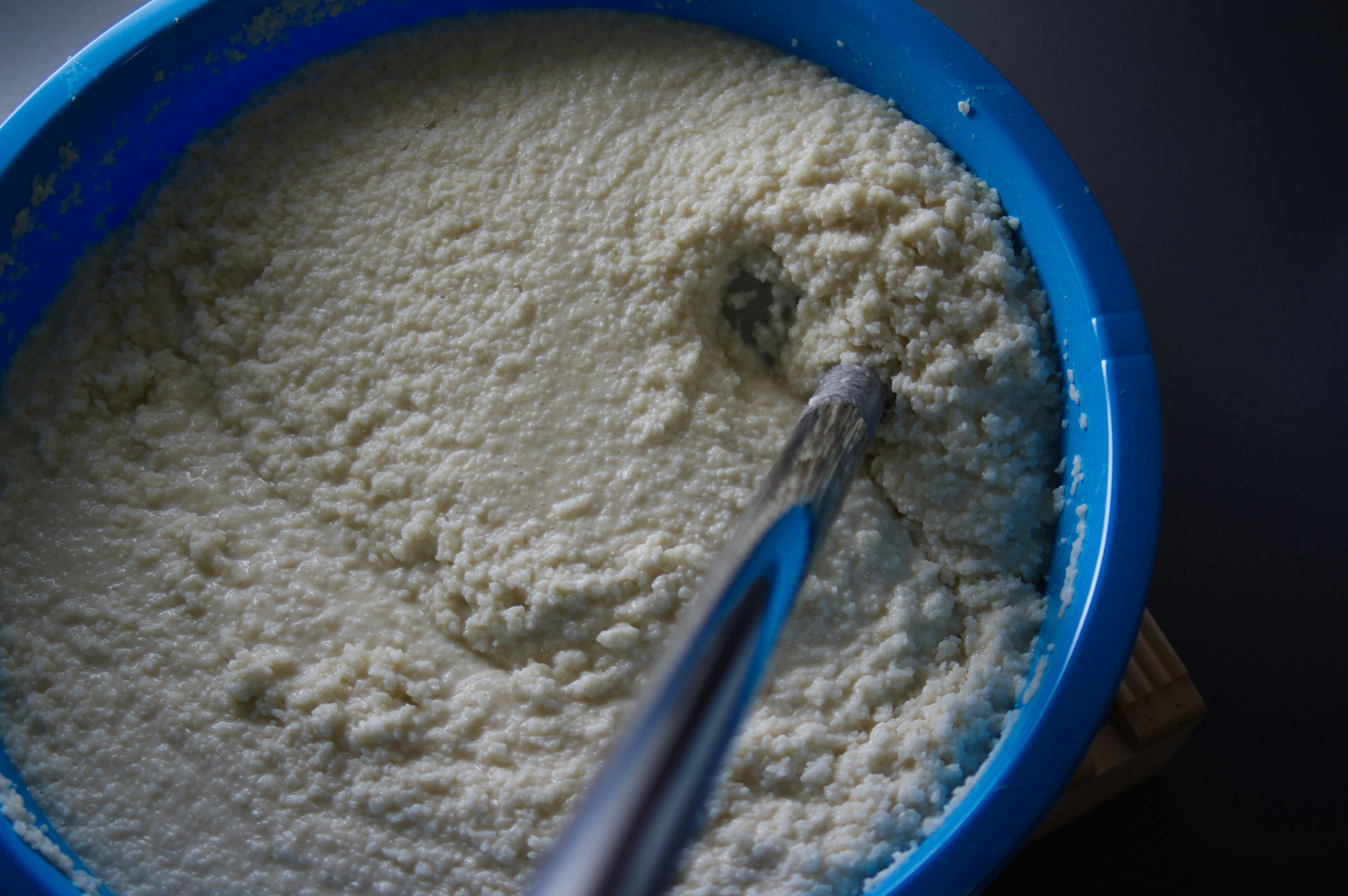 埋け飯後の蒸米と米麹と水を合わせ、時間をかけて水を吸わせていく