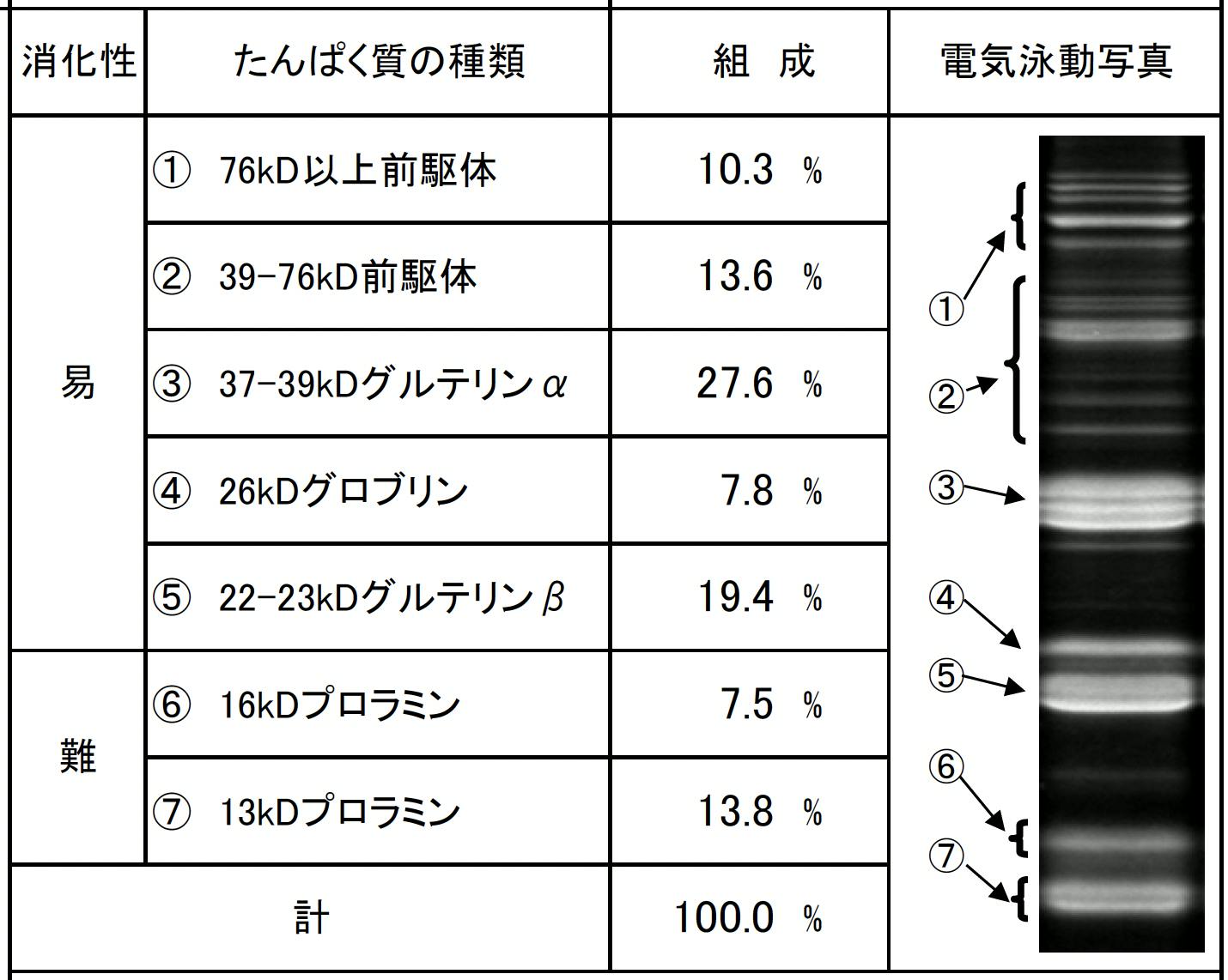 前駆体を除いた場合、PBIIに相当するグルテリン+グロブリンが約72%、PBIに相当するプロラミンが約28%という結果になりました。米は易消化性であるPBIIのタンパク質が多いことが分かります。ヒノヒカリとの比較は、今回のリターン品(解説PDF)で詳しくご紹介したいと思います。