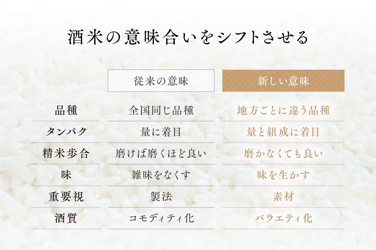 では、日本酒はどうでしょうか。従来の酒造りでは、華やかな香りを出す酵母や無濾過生といった製法に注目が集まる一方で、使用される酒米は全国的に限られた品種に偏り、さらに高度に磨かれることで素材としての個性が見えにくくなりがちです。