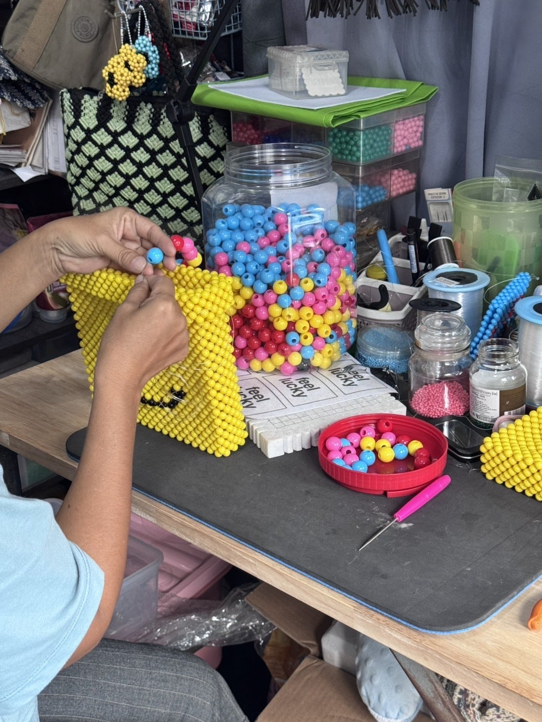 「feel lucky」のバッグをひとつひとつ丁寧に編み上げている