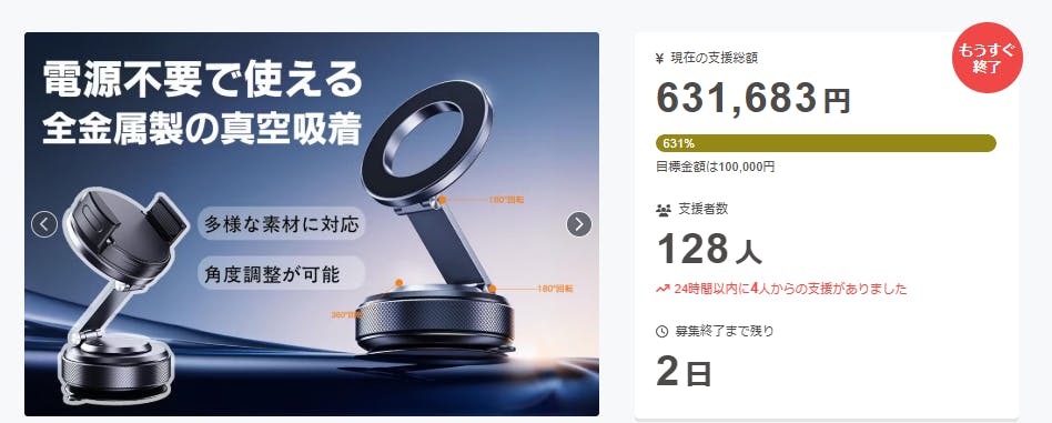 2025/09/16 09:35サポーターの皆様 おはようございます。【720°調整!多機能金属三軸!真空吸着、マグネット、クリップの3つの機能を搭載】プロジェクト運営チームです。本プロジェクトは無事に終了いたしました。本当に皆様には感謝の気持ちでいっぱいです。この場をお借りして深く御礼申し上げます。今後の輸送・配送の状況につきましては逐一こちらの活動レポートにてご報告させていただきます。引き続きどうぞよろしくお願いいたします。 もっと見る