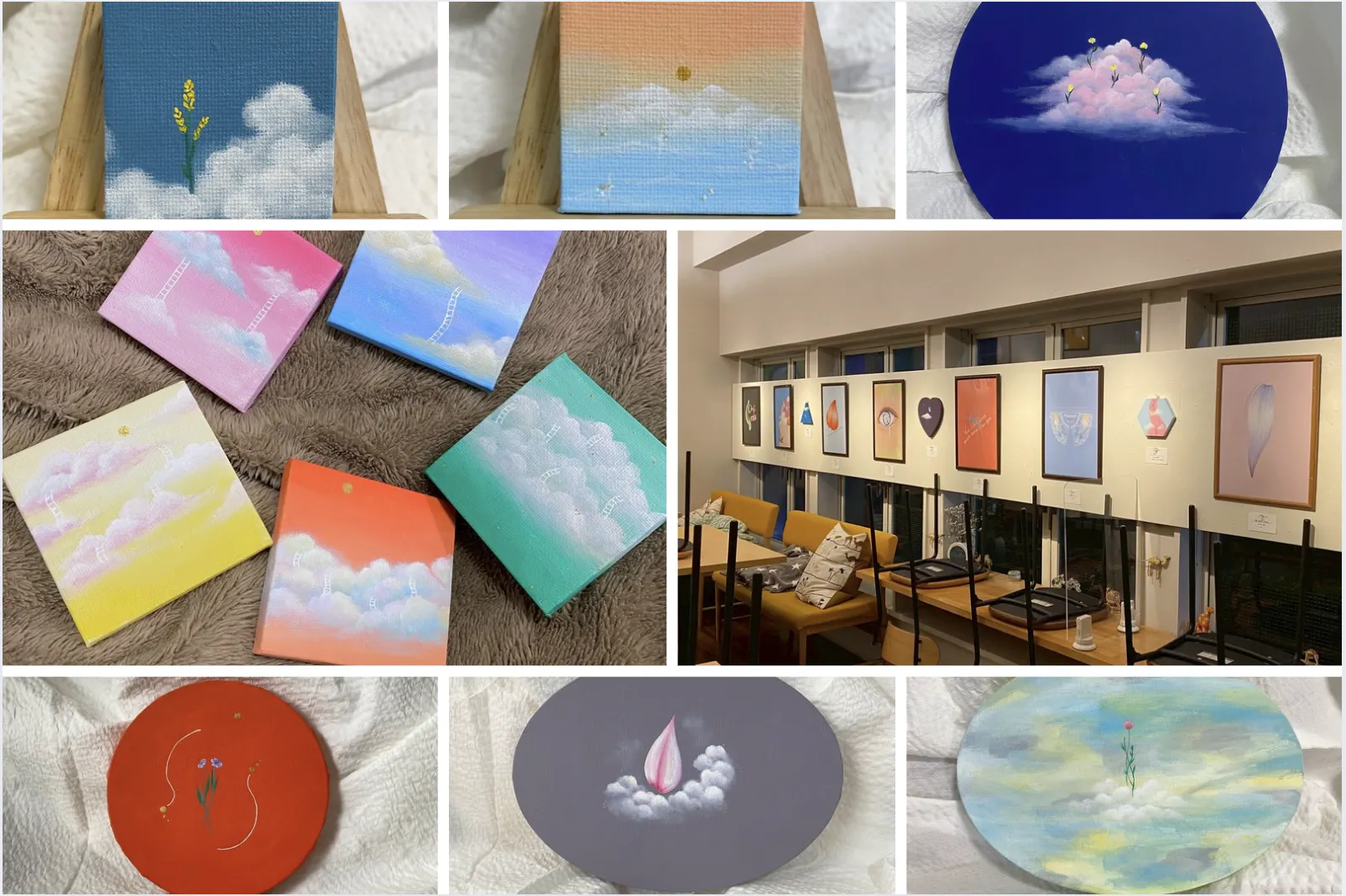 空と雲を映したカラフルなキャンバス作品が並ぶ展示風景今回は、“私の好き”で世界の子どもたちに夢を届けるという想いから、このクラウドファンディングに挑戦します。