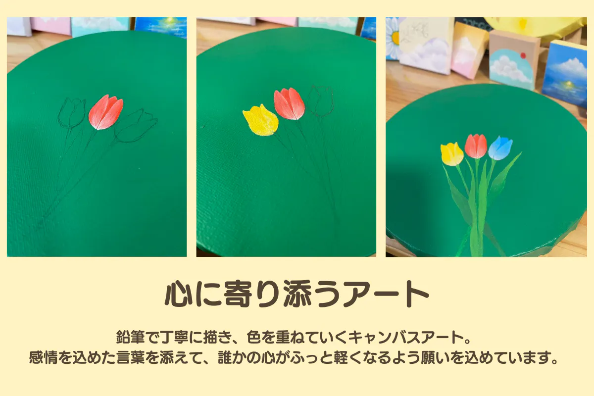そんな時に出会ったのが、キャンバスアート。色の癒しに惹かれ、カラーセラピスト資格も取得。「描くことで誰かの心を軽くできたら」と願いを込め、感情を言葉に添えて作品を制作しています。