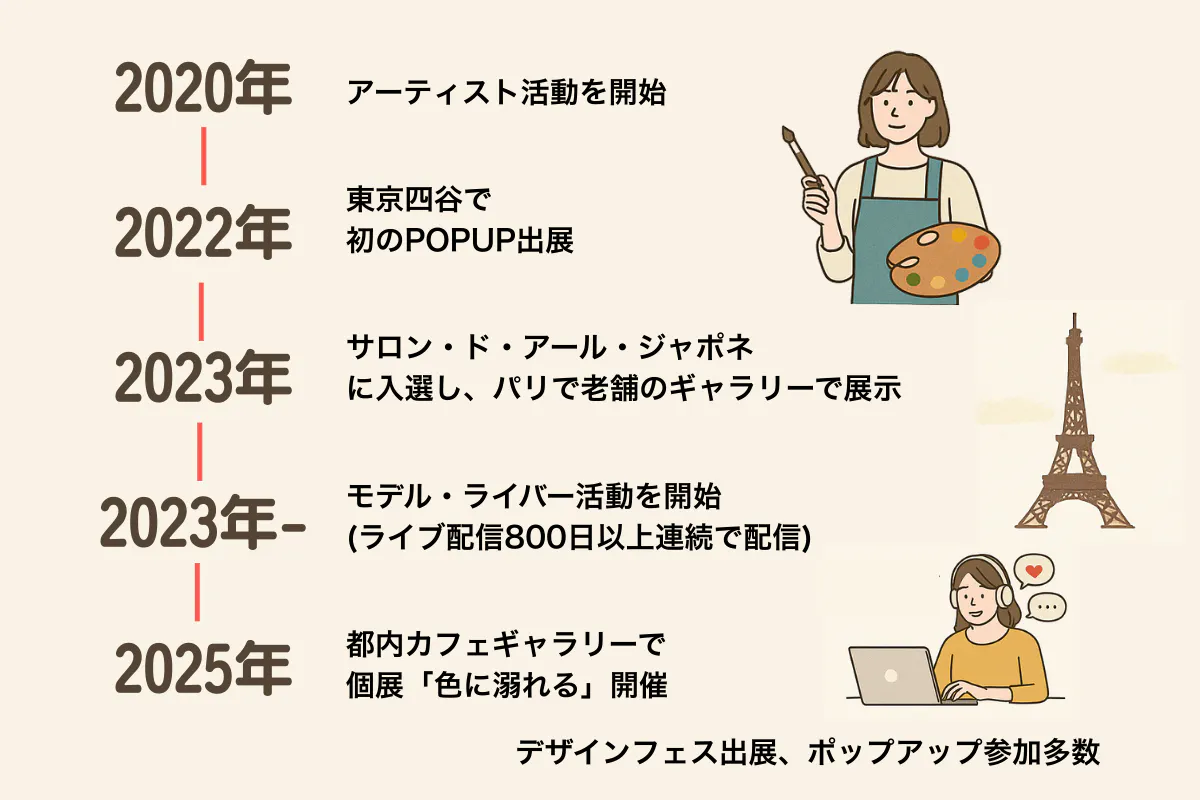 今は、個展・デザフェス・POPUP・ライブ配信を通して活動中。将来は、アートで“好き”に出会えていない世界の子どもたちへ、夢と自由な表現の場を届けられるアーティストになりたいと願っています。