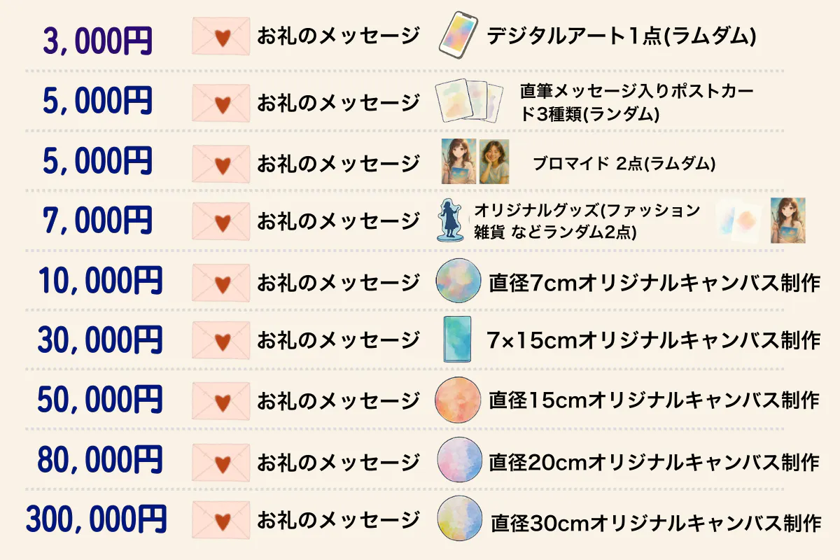 2025/10/09 21:28あと1日!ラストスパート!プロジェクトが始まって約1か月。始まって数週間は16%だった達成率も、只今、達成率79% 617,500円/780,000円支援者数158人始めたときは、こんなにもたくさんの方に支援いただき、応援いただけるとは思ってもいませんでした。私が夢をかなえ続けたところで、直接皆様に何かお渡しできるわけではありません。そんな中でも、私の想像する未来を一緒に願ってくださり、心弾ませて託してくださった偉大な皆さまです。そんな皆様から頂いた応援メッセージをほんの一部ですが紹介させてください。╭⋟───────────────────────────╮出逢った時からえりなちゃんの表現する絵が好きです♡活動を応援してます!おもいっきり楽しんでね〜!╰───────────────────────────⋞╯╭⋟───────────────────────────╮えりなの作品は見ていて本当に癒されます!頑張れー!!╰───────────────────────────⋞╯╭⋟───────────────────────────╮えりなちゃんの綺麗な心、考え方が大好きで尊敬しています。素敵な夢が叶いますように╰───────────────────────────⋞╯╭⋟───────────────────────────╮素敵な挑戦、私も背中を押されました。心から応援しています!えりなちゃん自身も、えりなちゃんのアートを楽しんでね!╰───────────────────────────⋞╯╭⋟───────────────────────────╮えりなが叶えたい夢応援してるよ!!いつでも味方だからね!!╰───────────────────────────⋞╯╭⋟───────────────────────────╮昔から変わらないえりなさんの優しくて素敵なお考えを、ずっと応援しています♩╰───────────────────────────⋞╯╭⋟───────────────────────────╮皆だけじゃなく自分自身も明るくなれるアートを! 楽しみにしてます‼╰───────────────────────────⋞╯╭⋟───────────────────────────╮インスタで活動見てたよ! えりなちゃんの描くアート、見てると心があったかくなる感じがして本当に素敵だなって思ってました!微力だけど応援してるよー!個展がんばってね❤╰───────────────────────────⋞╯╭⋟───────────────────────────╮お洋服から文章、絵画まで、これからますますの表現躍進を楽しみに、陰ながら応援させて頂きます…!╰───────────────────────────⋞╯╭⋟───────────────────────────╮自分の夢に向かって走る姿は誰よりもかっこいいし、素敵だよいつでも応援してる^ ^╰───────────────────────────⋞╯╭⋟───────────────────────────╮挑戦する姿勢に心動かされました。頑張ってください!╰───────────────────────────⋞╯╭⋟───────────────────────────╮クラファンほんの少しですが応援させていただきます☺えりなさん見ると可愛くて元気出るし私も頑張ろうって思います!応援してます‼╰───────────────────────────⋞╯╭⋟───────────────────────────╮なつみさんの個展の成功願っております!アートで人の心を動かすこと本当に素晴らしいと思います!自分もやっていたダンスでそういうものに熱くなるものを感じたことがあったので、表現者の応援がしたくなりました!╰───────────────────────────⋞╯╭⋟───────────────────────────╮初めて作品を目にしたときから、ずっと素敵だなと思っていたし、ほしかったので手元にくるのが嬉しいです!とっても素敵なプロジェクトだなと思いました。 海外進出、楽しみ!╰───────────────────────────⋞╯╭⋟───────────────────────────╮絵が素敵で、才能に溢れたえりなちゃん☺ 夢が叶いますように!がんばる姿に、私も元気をもらっています。お互い達成するぞ!!╰───────────────────────────⋞╯╭⋟───────────────────────────╮えりなへ。 絵のセンスも抜群で、配信ではいつもあたたかくて楽しい時間をくれるね。 のんベイなところも含めて、全部がえりなの魅力。 どんな時も自然体で頑張る姿を見てると、胸がじん
