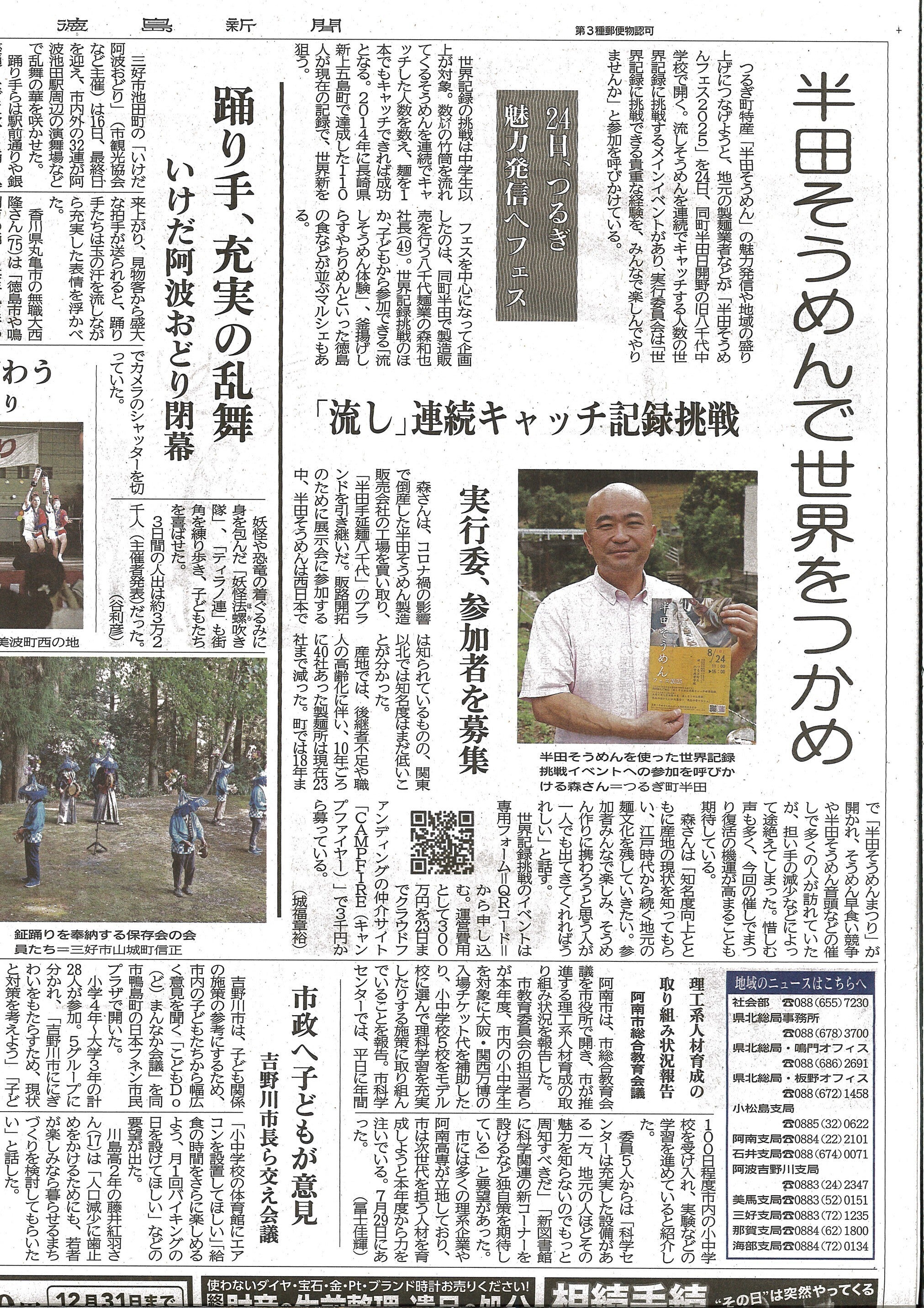 2025/08/17 16:19本日の徳島新聞朝刊でご紹介いただきました。フェス成功に向けて、しっかりと頑張っていきます!引き続き、よろしくお願いいたします(^-^) もっと見る8月16日に流しそうめん連続キャッチの練習会をおこないます。