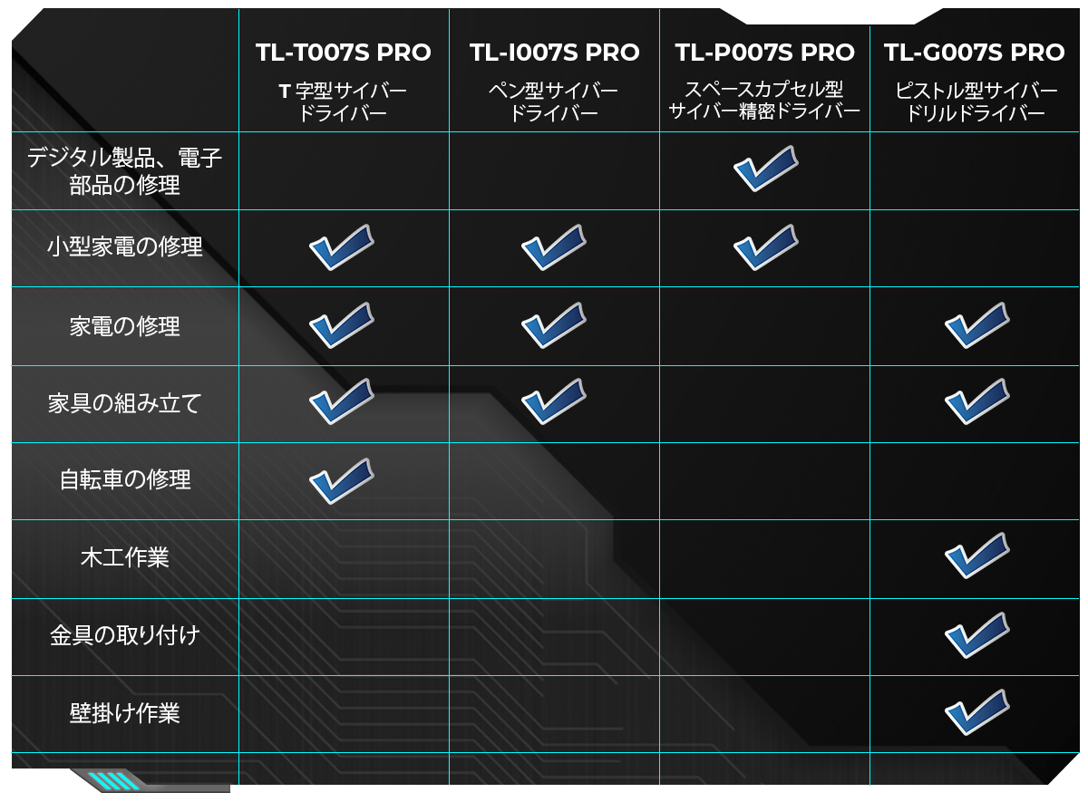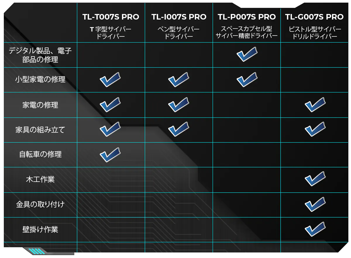 4つのツールが揃ってMechtron CYBERPUNK Seriesは完成します。それぞれのシーンと好みによってDIYライフをお楽しみください!