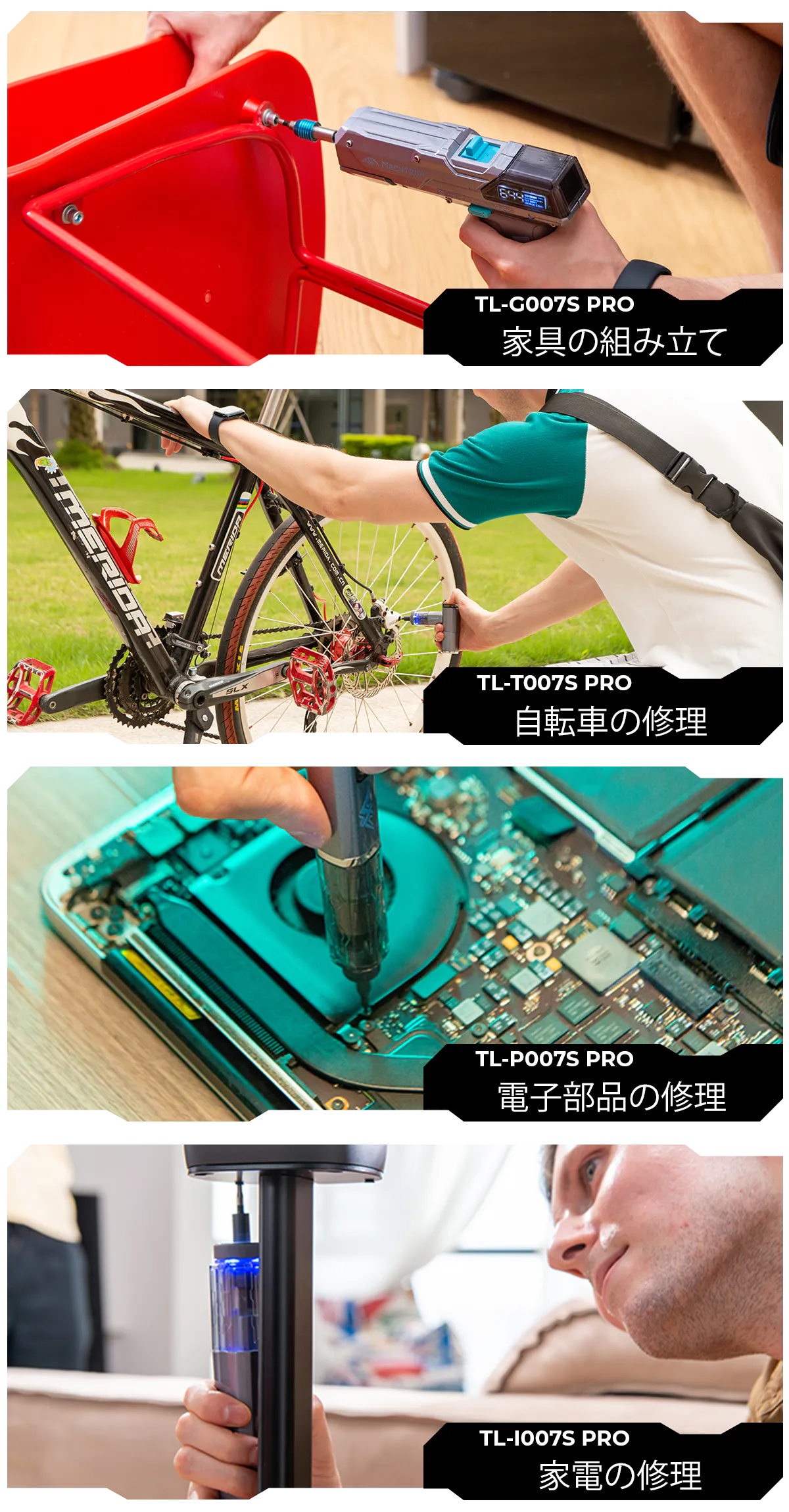 ツールを使い分けることで家具・家電といった大型製品からスマートフォン・PC等の電子機器、屋外では自転車のネジ止めまで幅広く使うことができます。