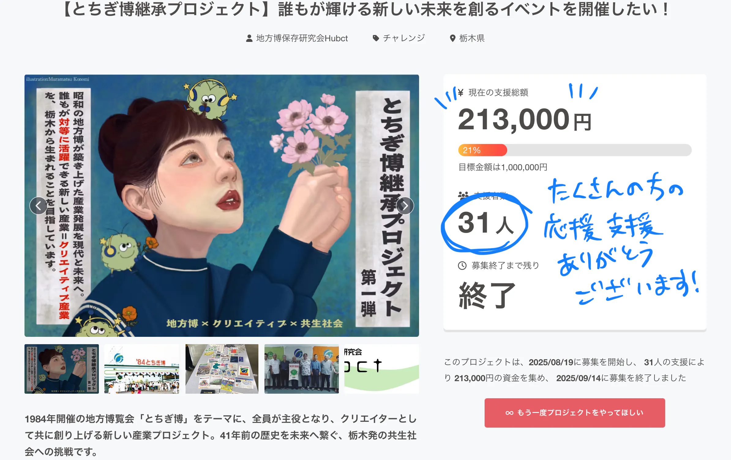 先日9/14 23:59をもちまして、とちぎ博継承プロジェクト第一弾のクラウドファンディングが終了しました。